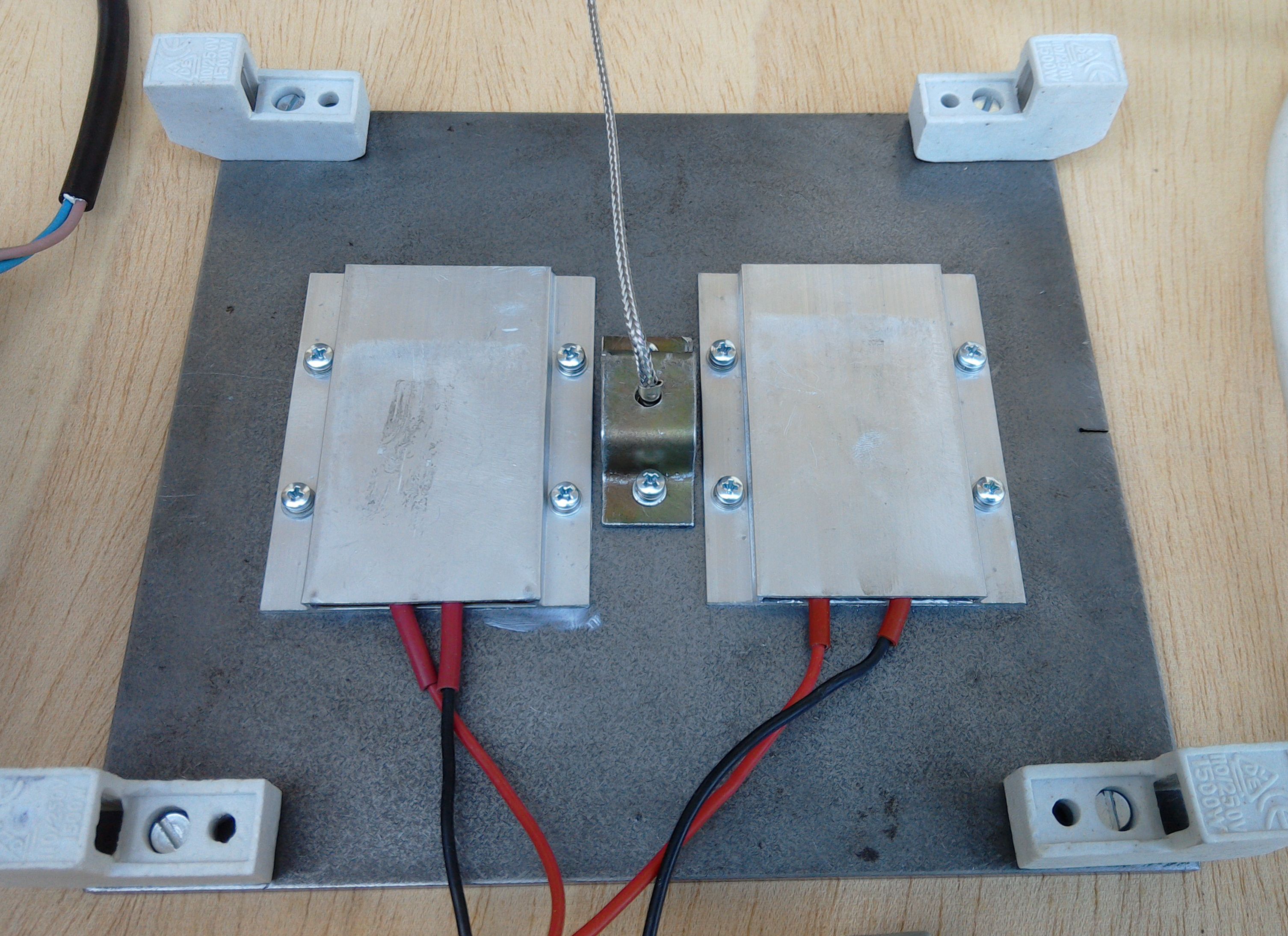 Kus výpalku ze šroťáku, 2x PTC ohřívací článek, PID regulátor, jako nohy jsou použity keramické držáky na halogeny.