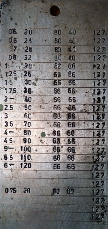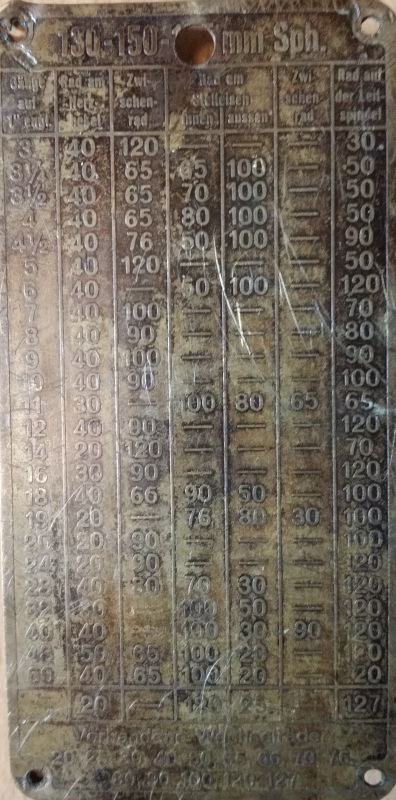 Dvojkolo na hřídeli č. 1 má 40 a 20 zubů. Těch 40 je jasných, 40 zubů je i na vřetenu tak aby byl výsledný převod "reverzátoru" otáček 1:1. Těch 20 zubů pak spolu s kolem 127 zubů na hřídeli č.4 (resp. přes dvojkolo 60/60 což je 1:1) dává výsledné stoupání 1mm/ot. Ok funkční, máme jedno metrické stoupání... ale jak sestavit jiná stoupání? Kolo 127 zubů tam být musí (zajišťuje převod palců na metriku) a jiná kola nemám kam dát... z výpočtů vím že pokud bych 20 zubové kolo nahradil např. 40 zubovým dosáhnu stoupání 2mm ale bohužel to 20 zubové kolo je "na pevno". Musel bych ho stáhnout stahovákem a nalisovat místo něj jiné... to asi nebude to pravé ořechové...