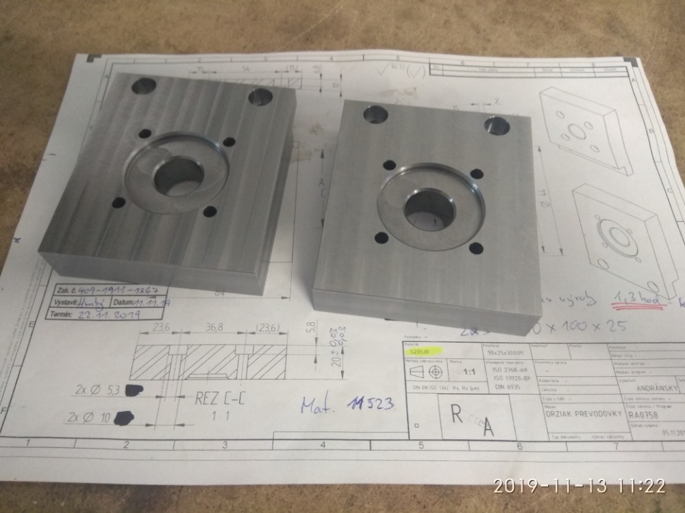 Zdravim, takmer vsetky diely su z konstrukcnej ocele. okrem Os Y ktora je z hlinika koli dynamike. Drziak vretena je tiez zelezny z 3 dielov. Najprv som chcel polotovar pod kolajnice navarit, zmenili sme to na srobovany spoj s kolikmi a lepidlom. Nasledne sa opracovali kolajnice.