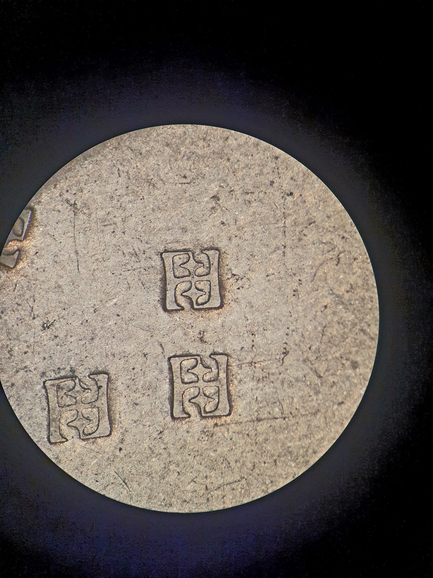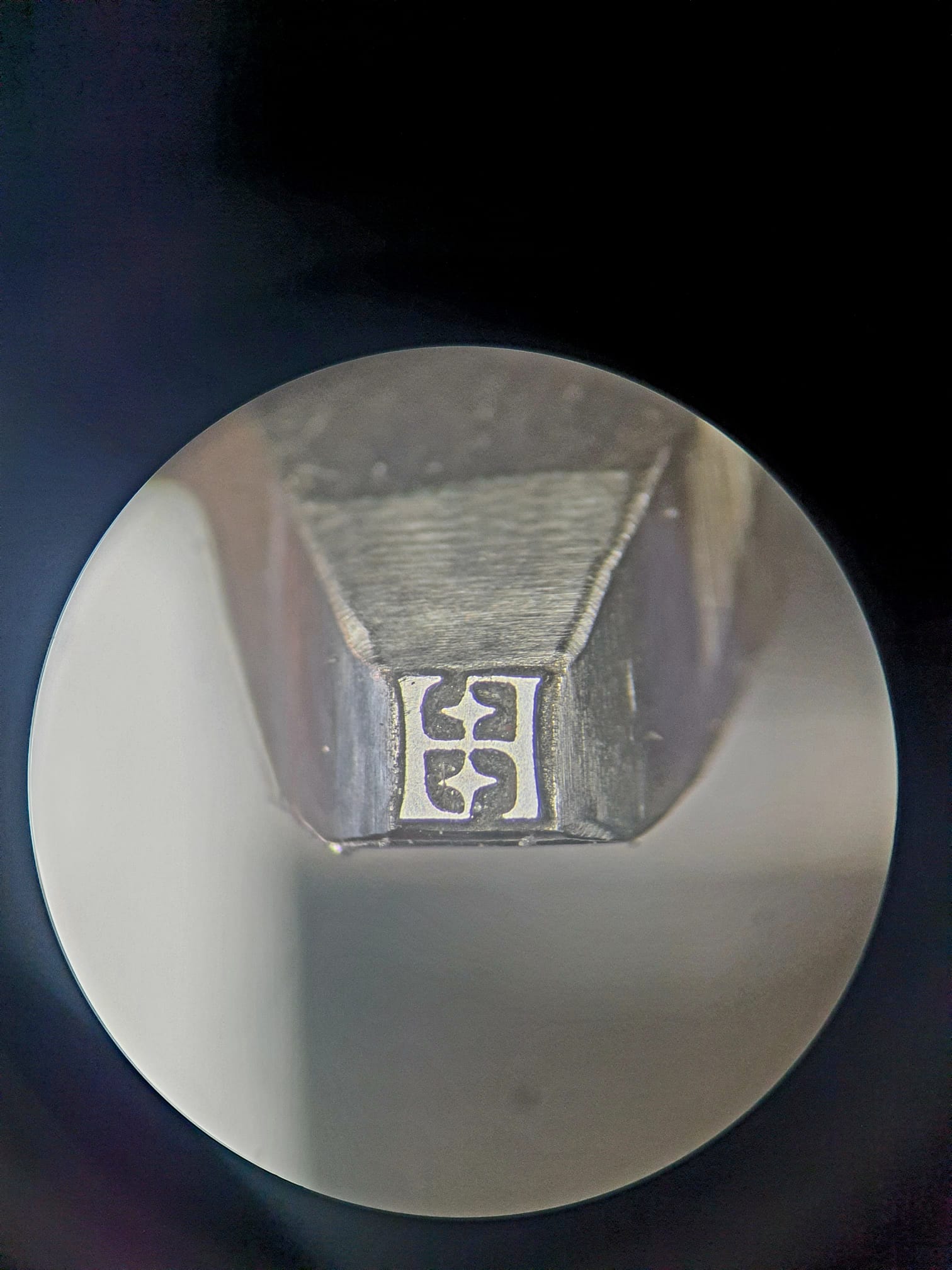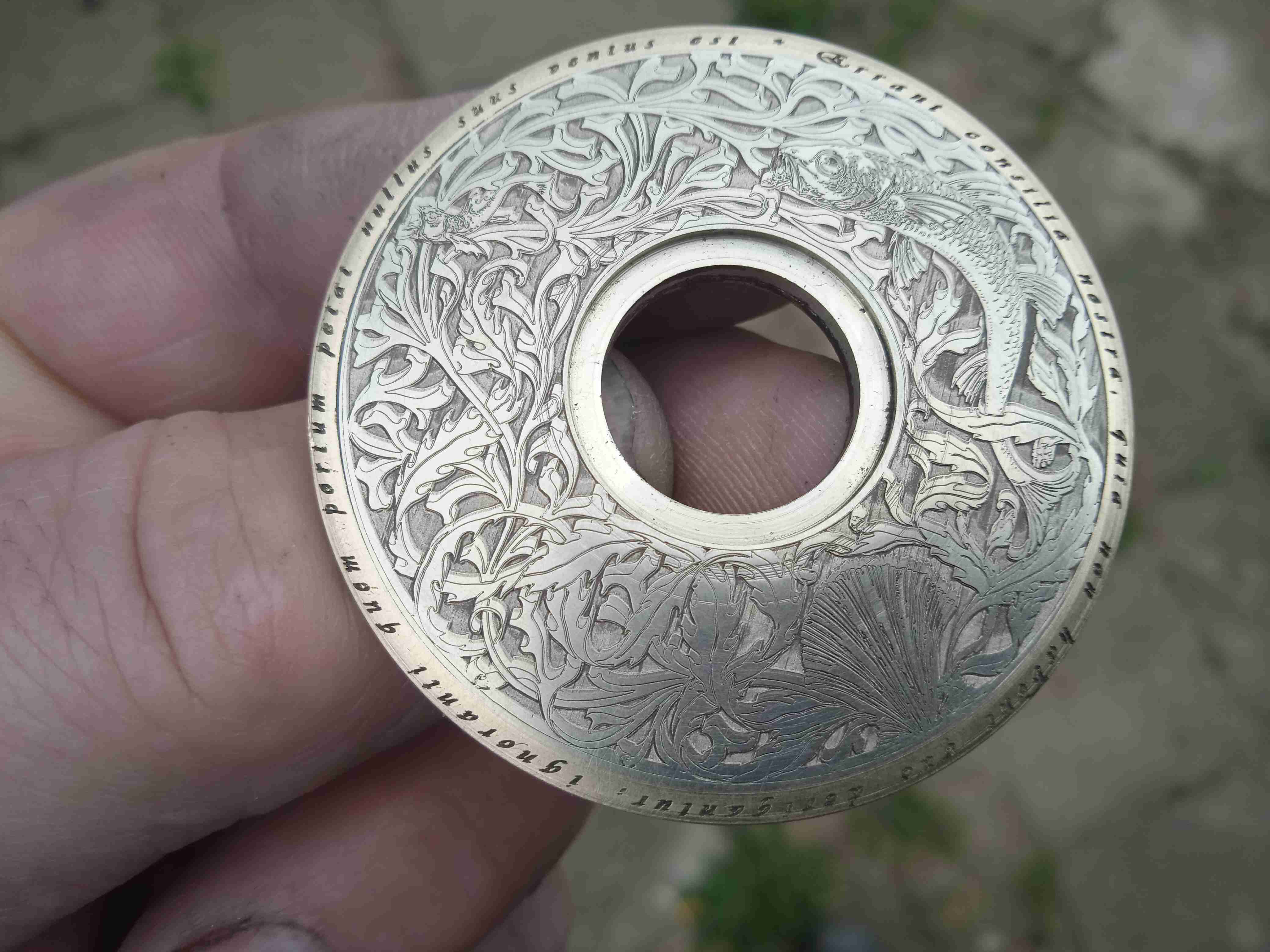 rybí mandala z alpaky zasazená do mosazi, vnější mosazný kroužek, kde je latinský nápis má 2mm, střed je vypouklá zalisovaná alpaka, síla cca 3mm, gravírováno do hloubky asi 0,4mm, ještě to musím vyleštit, okem to nejde vidět ale z foťáku koukám u středu jsou vrypy