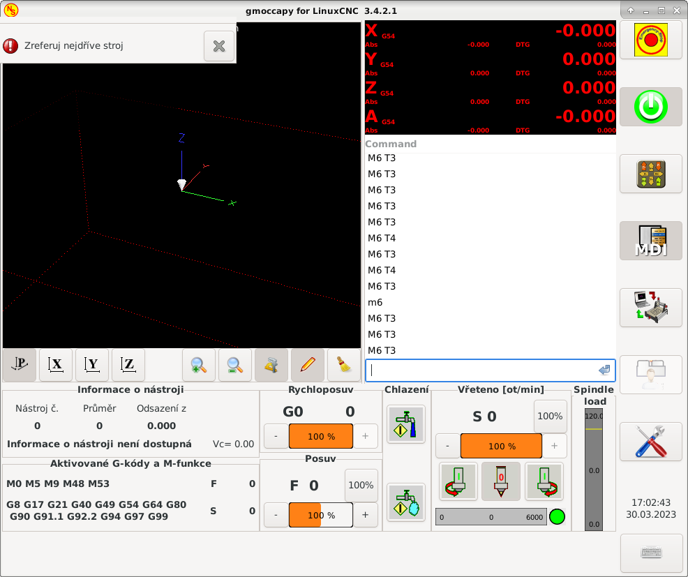 Obsluha po starte stroja MUSI vykonat referencnu jazdu, inak je zablokovany automaticky rezim, zaroven musi na display potvrdit, ze aktualna pozicia je ta, ktora je aj zobrazena na obrazovke.