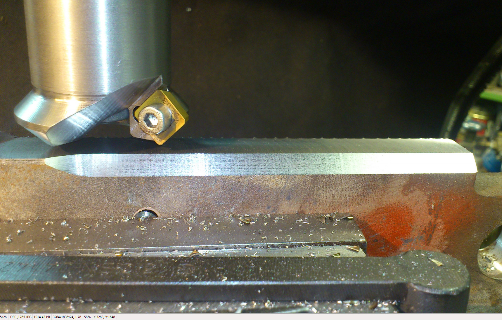 Dobrý nápad, to je pekné, to máš asi plátok SPET, používamna zrážanie túto frézu, ale iba asi do 9x45°, potom tam už neni rovina. Potreboval by som aspoň na 15mm. tak sa musím poobzerať po poriadnom plátku, alebo dva po 180°