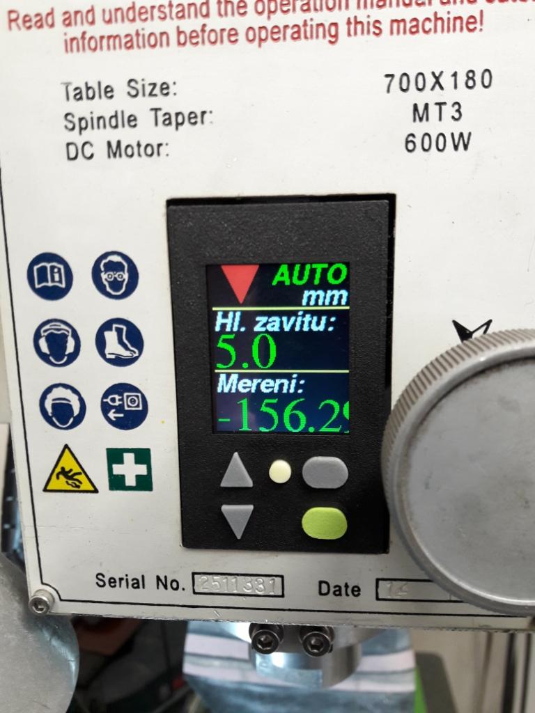 Vestavěno místo původního odměřování osy Z. Nastaví se hloubka závitu, najede se posuvem Z o > 1 mm nad díru, ručně se najede pinolou do záběru, po dosažení nastavené hloubky závitu se vřeteno reverzuje a zase vyjede ven, kde se buď přepne do normálního směru otáčení a zastaví, nebo jen přepne do normálního směru otáčení (pro dělání více závitů v řadě). Funkce odměřování zůstala zachována.