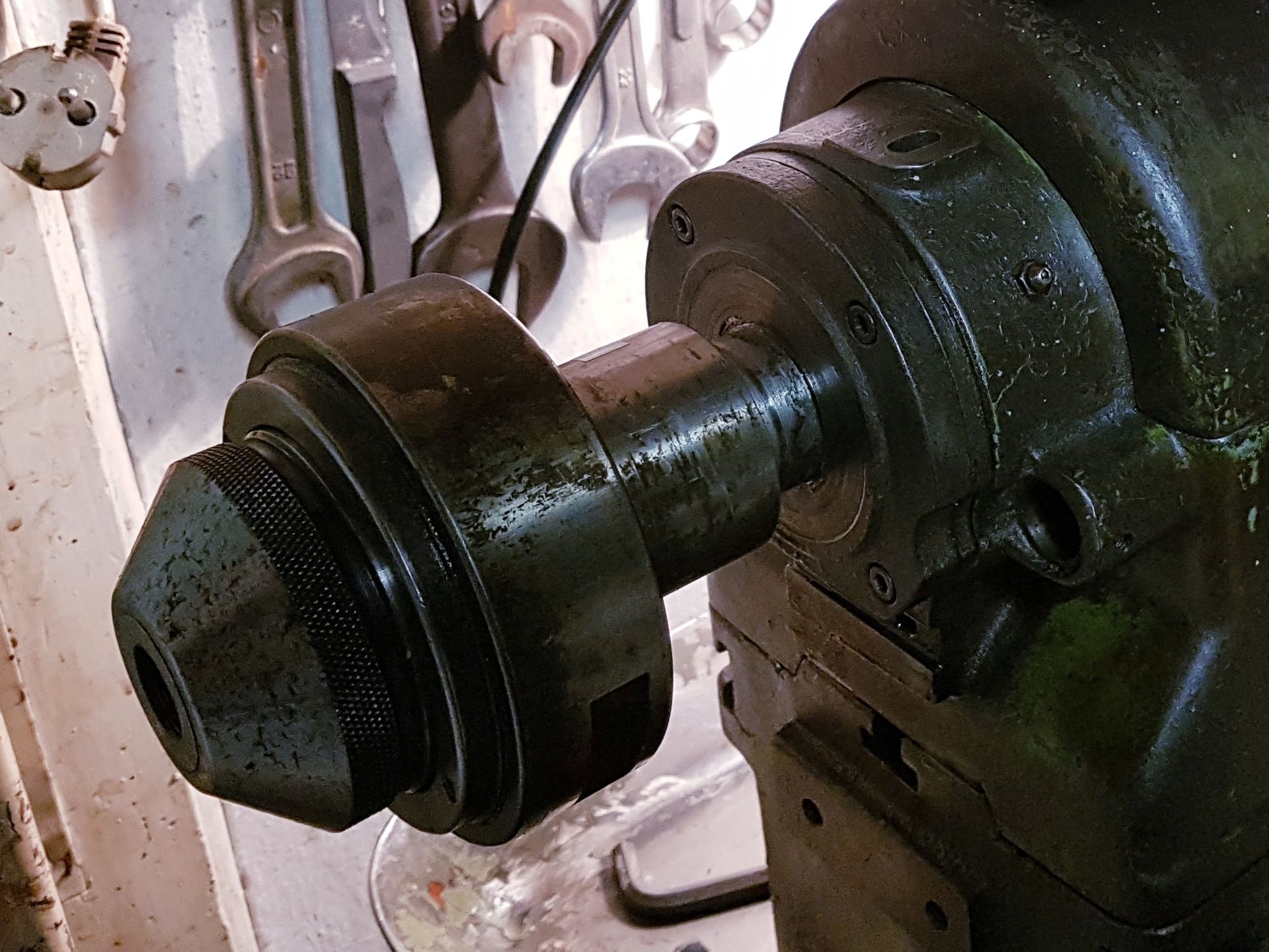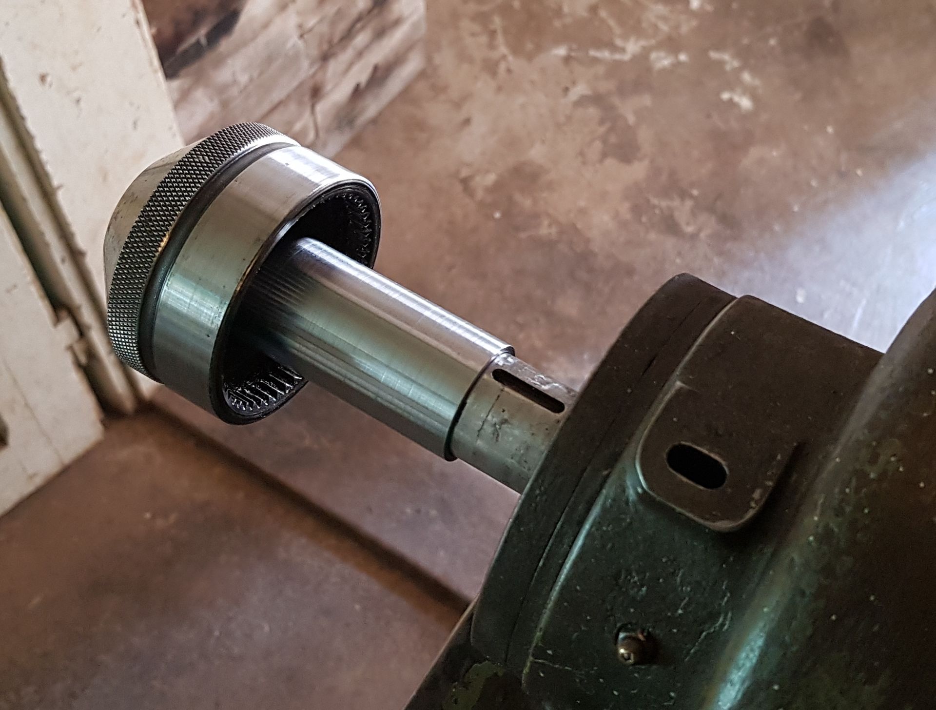 Takovou jednoduchou věc, která mi ale udělala větší radost, než jsem čekal. K utahování kleštin ve vřetenu jsem dostal pouze tyč, určenou k použití s podávacím mechanizmem. Pokud jsem chtěl použít kleštinu, musel jsem nasadit i část tohoto mechanizmu, což vypadalo úchylně, vydávalo to otravné zvuky a hlavně to tu tyč povolovalo. Včera jsem konečně sehnal relativně vhodnou trubku a dnes jsem z ní vytočil jeho náhradu. Možná to stále vypadá trochu úchylně, ale s tím už toho moc nenadělám, ostatní problémy jsou pryč a nečekaný bonus je, že se mi teď daří stejnou kleštinu utáhnout lépe (nevyjíždí mi z ní fréza).