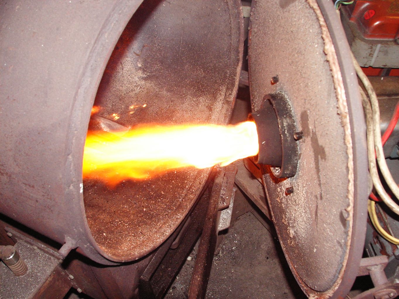 Stav je zatím ten. že to docela čadí a plamen vypadá divně i když je poměrně krátký oproti tomu co jsme měli s tlakovou tryskou. Pozdě večer už ale přestalo jít hořák zapalovat, zatím nevíme proč, přestalo být nutné dávat kolem plamene prstenec. Pořád ale trvá že naše regulace primárního vzduchu je příliš hrubá, nemáme ani vhodný tlakoměr. Na vstupu je totiž povolený tlak 3-5 PSIG což je nějakých 20-38 kPa. Všechny redukčáky co tu máme regulují až tak od 1 atm . Další moje doměnka vede právě k tomu stech. množství, protože ventilátor hořáku je původně navržen pro cca 40kW hořák což tato tryska asi nesplňuje, přesto že je klapka přivřená, myslím že hoření může ovlivnit i rychlost proudění sekundárního vzduchu.