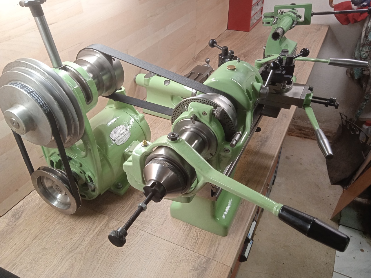 dodělával jsem jen dorazovou tyč kleštinového upínání a bombírovanou řemenici motoru pro plochý řemen