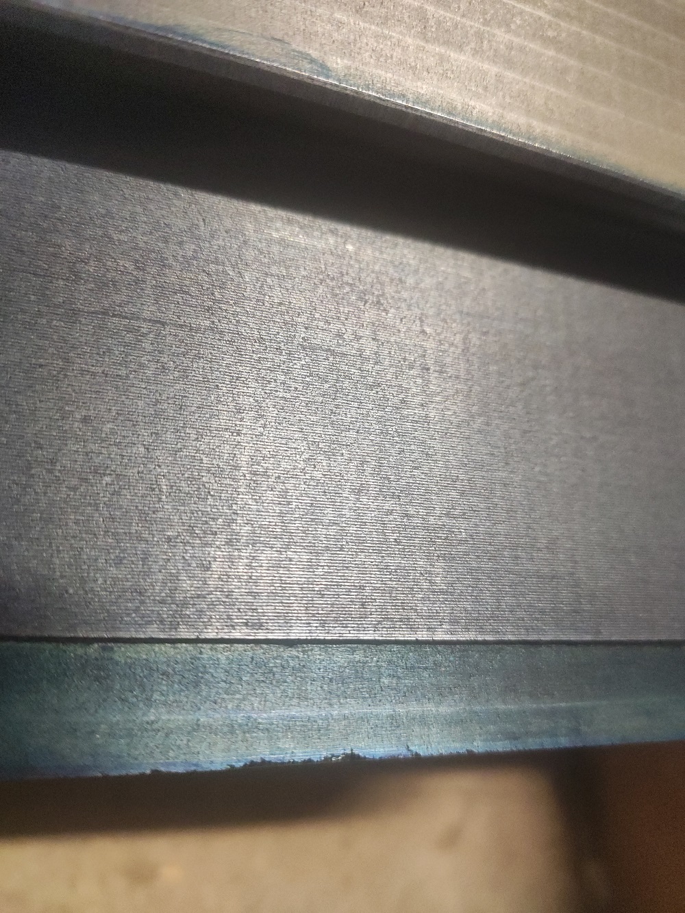 Evidentně to bylo na hoblovce. Podle toho manšestru na ostatních plochách. Ten detail na spodní fotce sice není moc rozpoznatelný, ale řekl bych, že je to taky hoblované na jemný povrch. Bruska by takové souběžné vrypy na pocrchu v takové délce asi neudělala. Alespoň jsem se s tím nikdy nesetkal. Pokud nebyly brusky na takovéto broušení rybin a byla k dispozici hoblovka, tak se to vyhoblovalo a následně zaškrabalo. Pokud máš po hoblovce souběh v 1 a půl stovce, tak řekl bych, že je to výborné. Jaký je povrch těch šikmých ploch rybiny? Ta modř to taky trochu zkresluje, opticky.