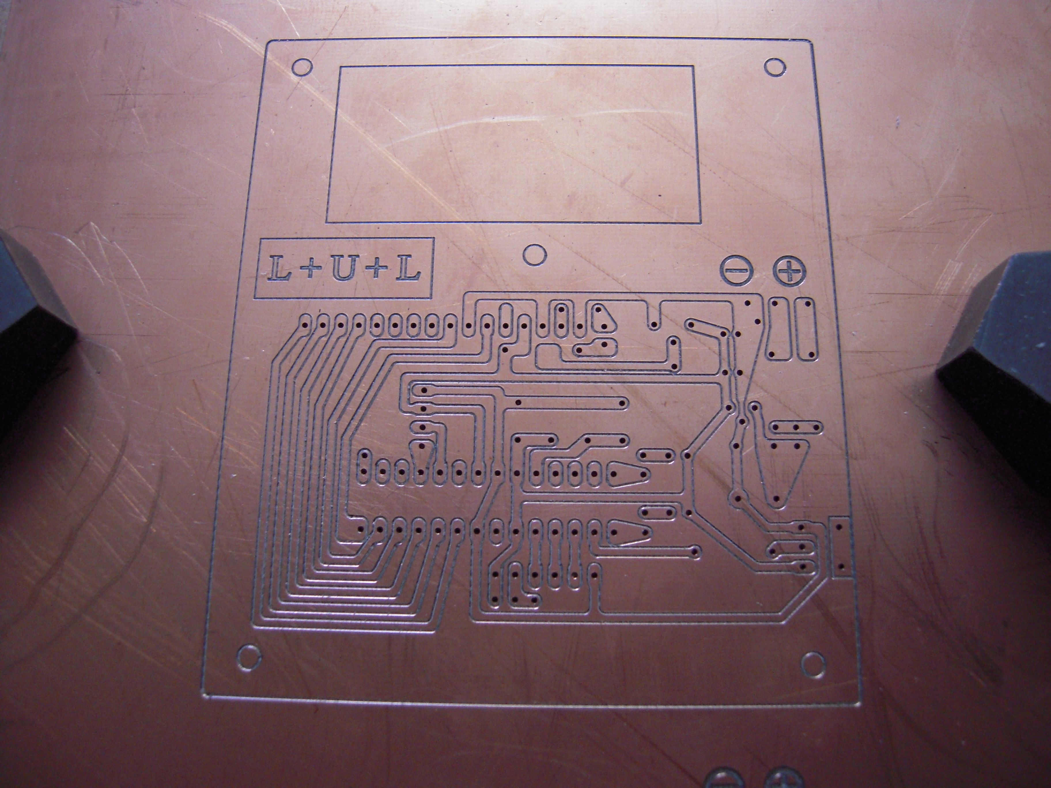 Frézovat DPS jsem už zkoušel. Na vyfrézování drah jsem na základě rady jednoho člena fóra použil TK kopinatý vrták pr. 0,8mm s vrcholovým úhlem 90°. Vypadne to nádherně čisté bez otřepů ale je to náročnější na rovinost desky a správné nastavení záběru, protože s hloubkou frézování nabíhá aproximace úhlu nástroje. Otvory v desce na fotkách jsou vrtány TK vrtákem pr. 0,8mm, takže můžete porovnat šířku "čáry" s průměrem otvoru.