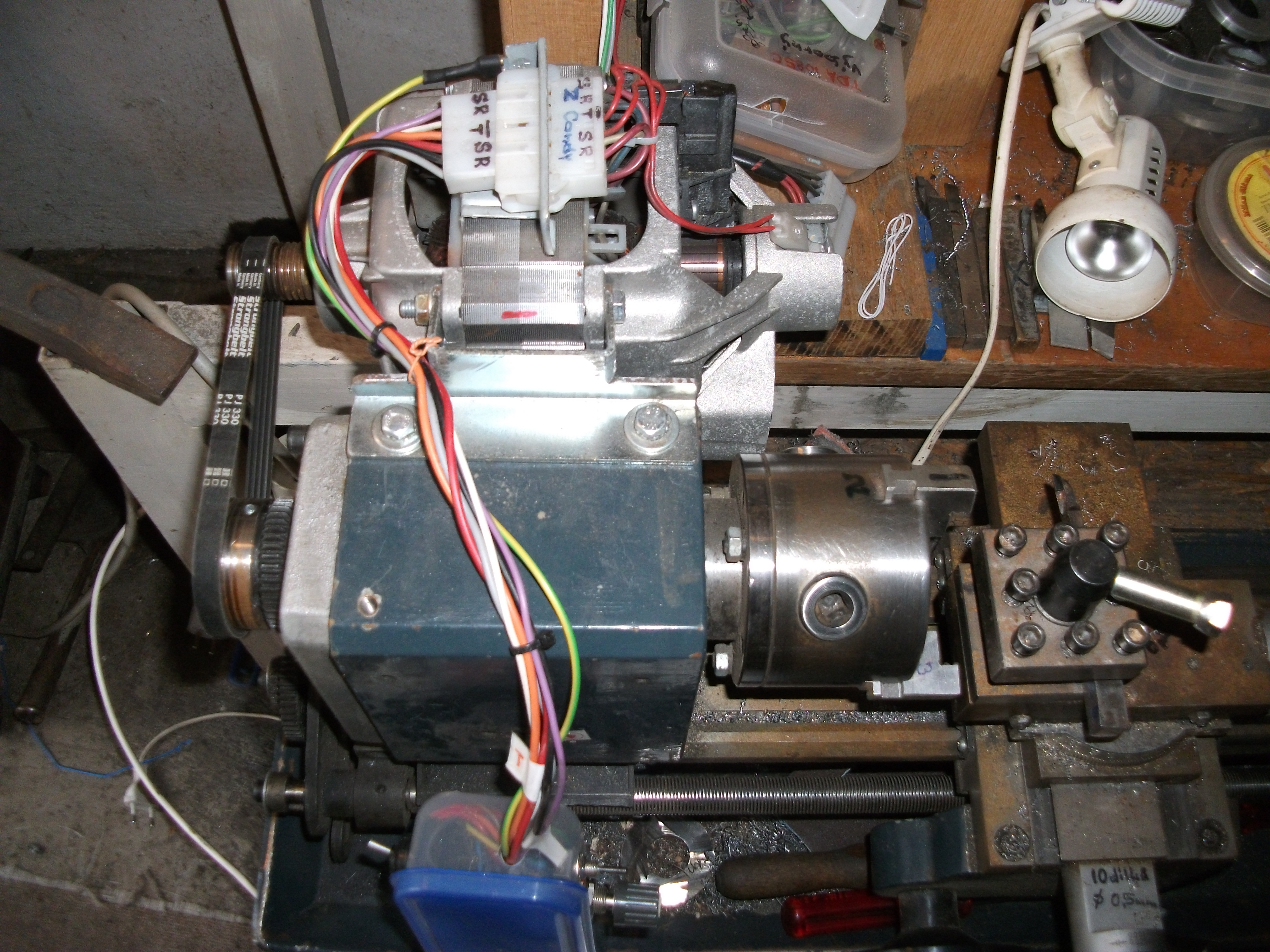 Chtěl jsem předvést jak číňan s pračkovým motorem fachčí na automat. posuv. Půl roku jsem na soustruh nesahal,a i tak jsem potřeboval něco osoustružit....nachystal jsem si válec duralu. Při utahování polohy nože mi klička hlavy nožů (omlouvám se neznám strojařské termíny) zůstala v ruce,ulomila se v závitu-to jsem spravil. Ale pak jsem zjistil že plastová kolečka od automat. posuvu mají vylámané zuby. A další plast. kolečko jsem do..rvil sám, neboť aby mi pěkně sedl kryt jsem se rozhodl čelo od řemeničky uříznout flexou (nemám možnost jinak soustružit-že bych čelo odsoustružil)...soustředěný na řez další plast kolečko jsem začal tavit proudem jisker. Borec. Nevíte mi poradit,kde tato ozubená kolečka,z plastu,či lépe z kovu shánět? Na obrázku je vidět uchycení motoru-řemenička je až na zadních matkách univerzály,takže nic by nebránilo mít tam i automat. posuv-až na ten plast. A v pohodě suport dojede až k univerzále....