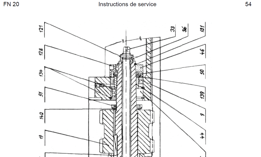 tady v těch klonech Deckela (aspoň mám zkušenost s FN 22, FN 25) bývá šroub na vnitřním konci s vnitřním závitem M22x1,5 a na vnějším konci je matice s jemným závitem, pojištěná příčným kuželovým kolíkem (č.121). Takže kolík vyrazit, matici vyšroubovat a šroub protáhnout dolem vřetenem. Dávám ilustrační výkres, i když vodorovného vřetene, šroub bývá principielně stejný. A.