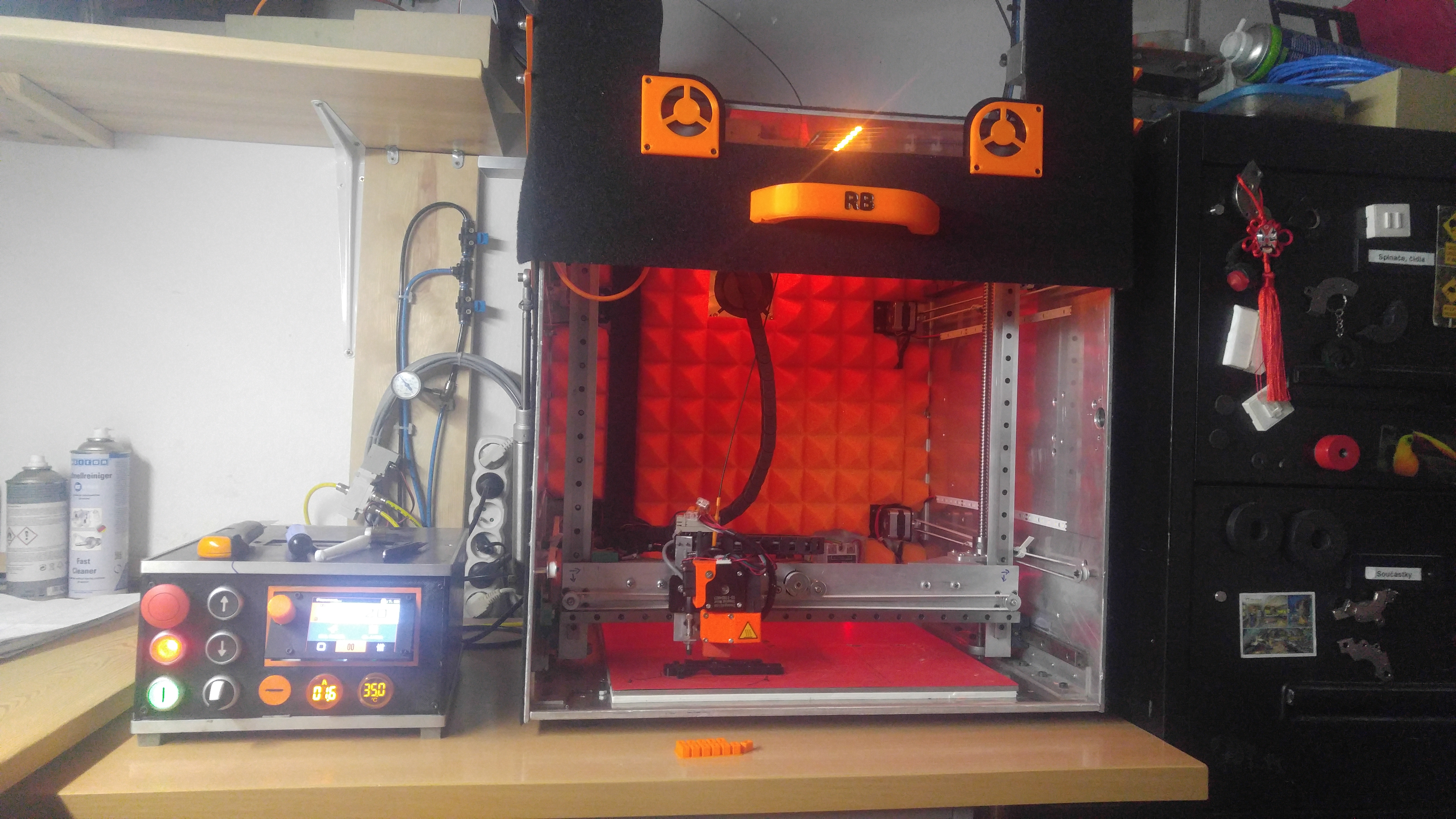 Po nejake dobe trochu progress, tiskarnu uz mam z dilny doma a hraju si s el. Dokonce se to uz i hybe