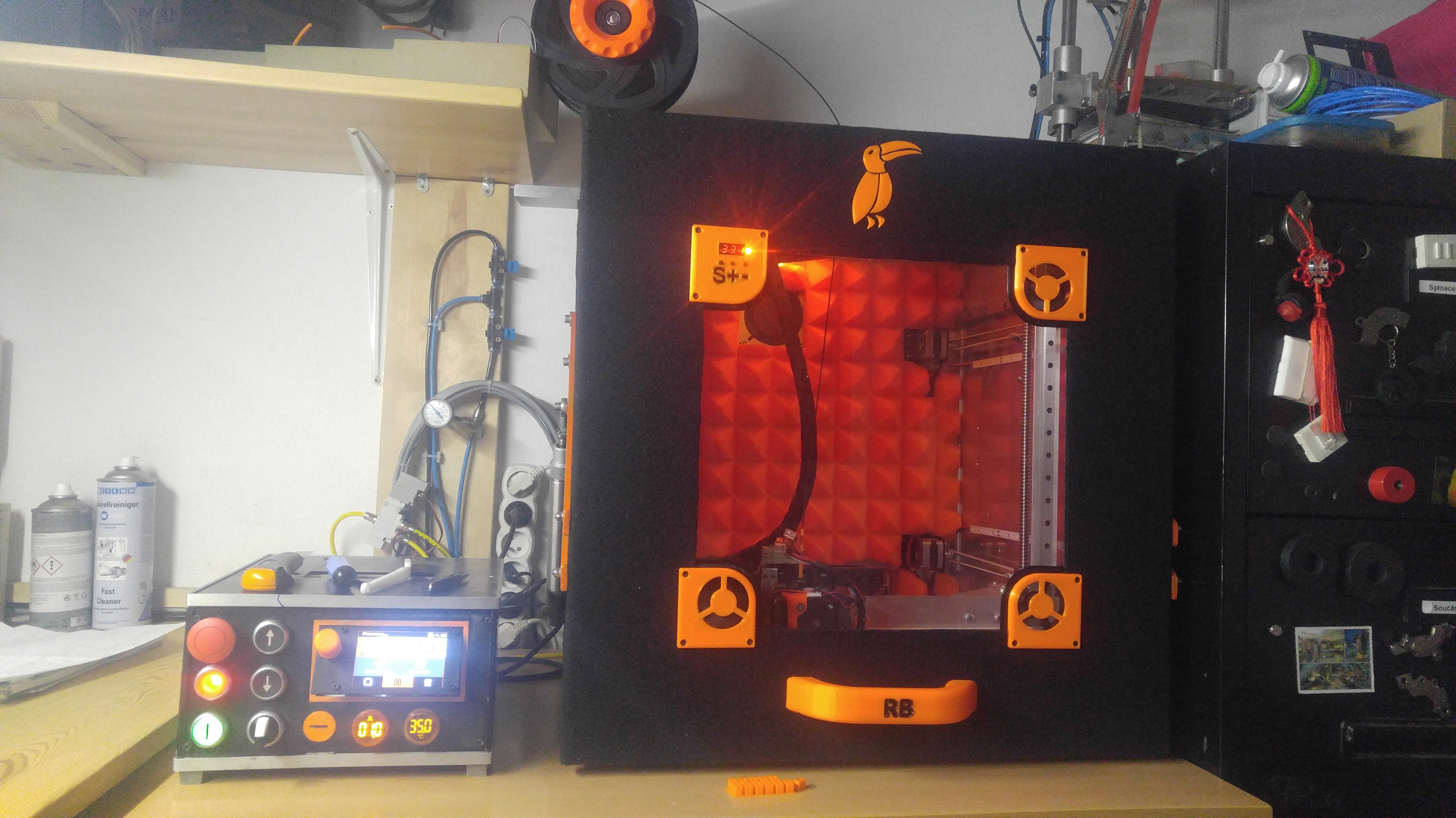 Tak jsem zase trochu pokrocil se stavbou toho meho monstra Jeste je toho hodne co je treba udelat, ale tiskne a to je hlavni Na tom odvijeci jsou cidla ktere hlidaji konec filamentu ale i zaseknuti/zamotani civky. Vyhledove uvazuji o jinem extruderu/hotendu. Mozna vodni chlazeni. Jo a ten fan v tom videu co huci po zapnuti musim vymenit, ten je v haji