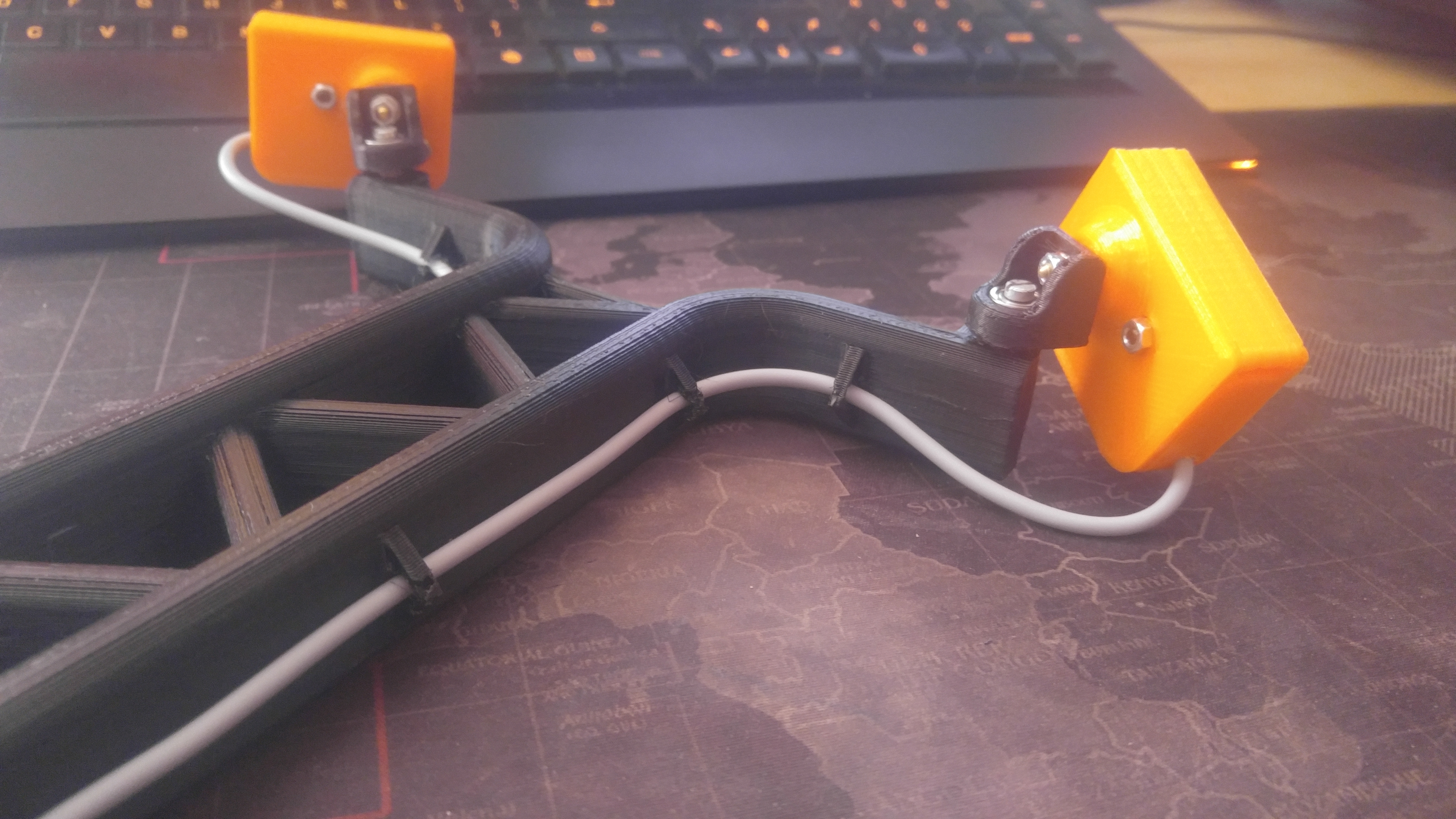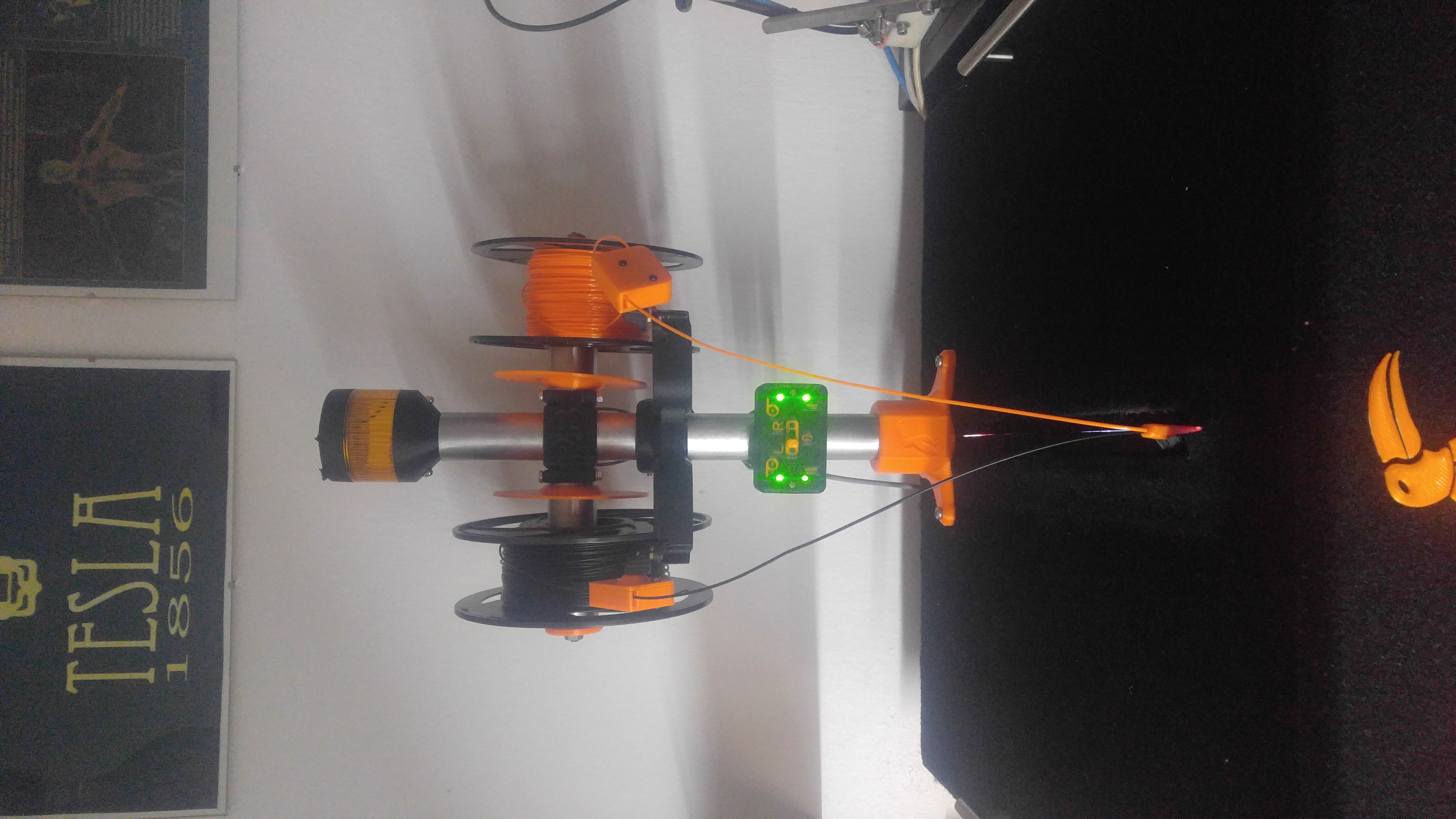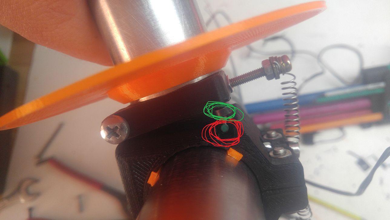 Je to videt na seste fotce, na stojanu je 3mm cidlo, na rameni je sroubek ktery to cidlo snima. Rameno je na pantu, je tam pruzina. Kdyz se filament zamota, nebo zasekne, tak se rameno pritahne k tiskarne a sepne to "filament sensor" vstup na desce.