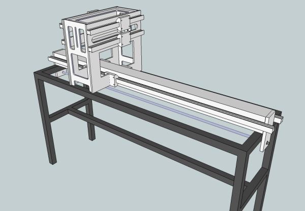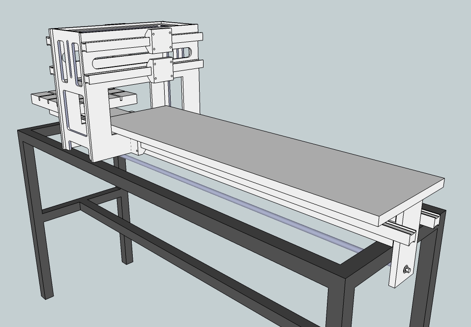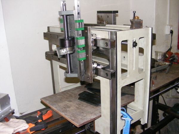 Měl mít hřebenové převody jak na ose X, tak i Y, osa Z pevná, stavitelná jen dorazy, pro zdobení kůže dostačující, řízeno malým PLC s možností ovládání dvou kr. motorů. Postupně po studiu fóra, rostla chuť, tak přibyly kuličkové šrouby Y,X i Z.