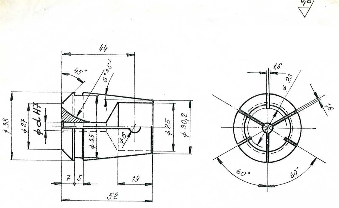 Nejsem sice erudovaný ale kleštinky jsem si kdysi vyráběl na dlabačku. postup byl takový to, z kulatiny jsem vytočil odpovídající kužel a vyvrtal díru kterou jsem vystružil na daný průměr nástroje vše na jedno upnutí,potom jsem vyrobyl duši daného průměru na každé straně se závitem vložil do obrobku jemně utáhl matice a pilečkou na fréze vyřízl dělící drážky-finále odjehlit zakalit-já jsem necementoval ale pokud by došlo k cementování počítat z cementem navíc.