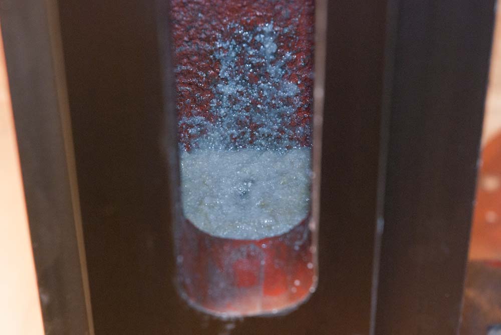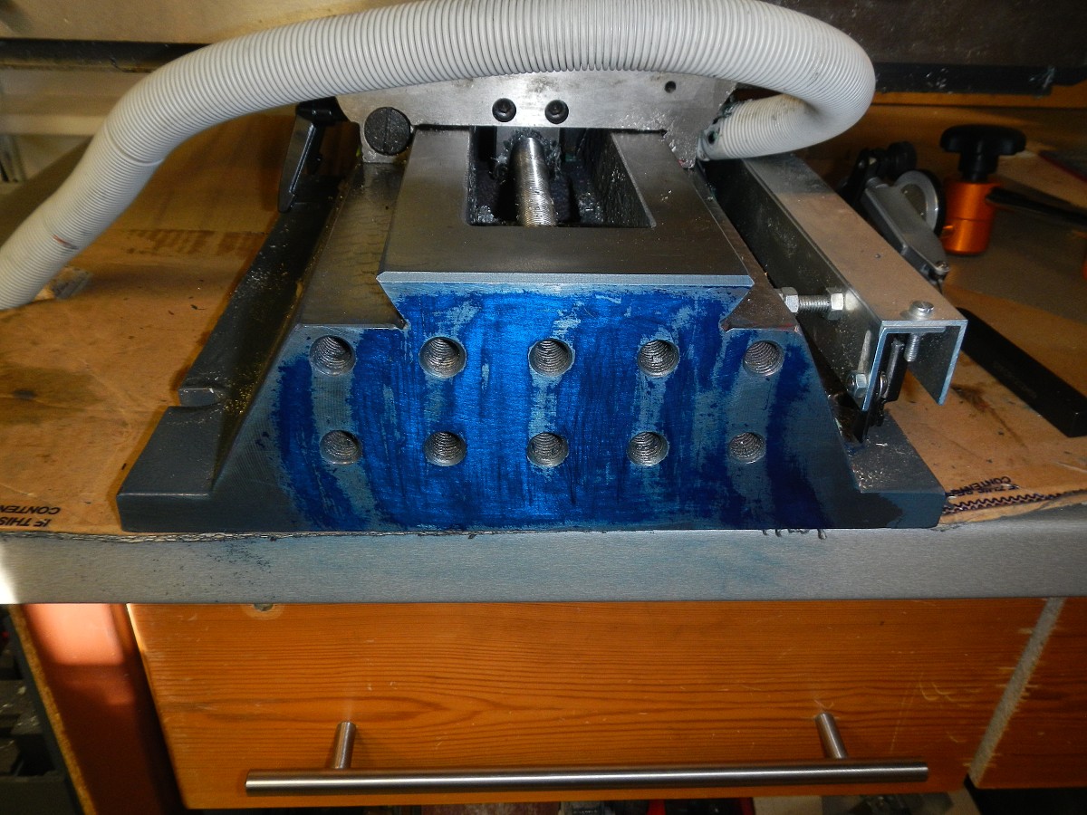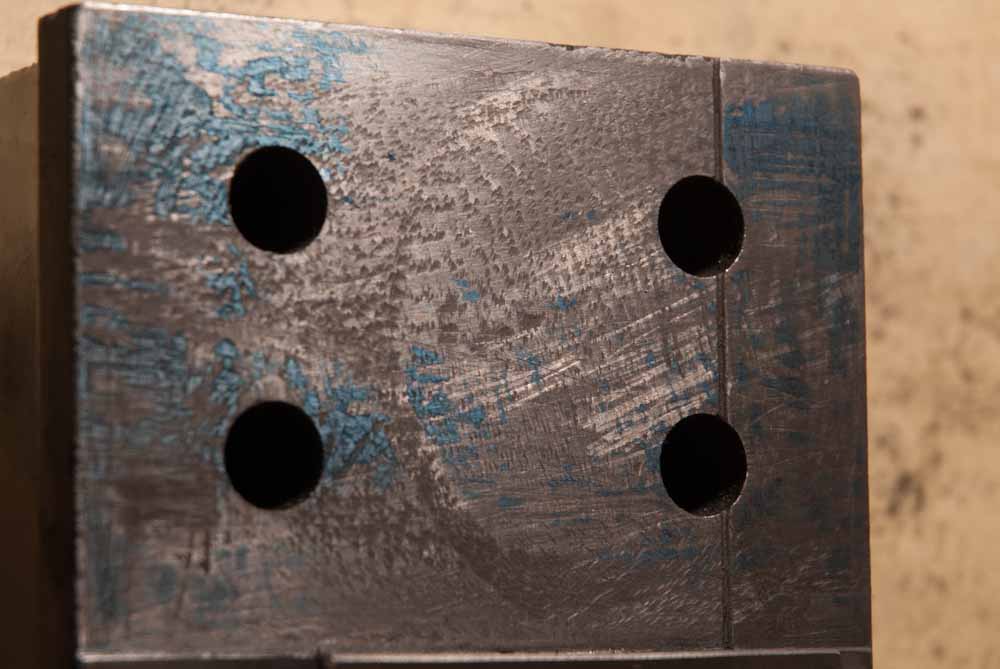spoj sloup základna, se skoro divím, že to vůbec drží pohromadě - je patrné, že spoj na sloupu byl opravován ručně bruskou. No tak jsem zkusil škrabat. Materiál sloupu je měkký, šlo to nabroušeným pilníkem - a protože nejde o pojezdy, doladění diamantovým brouskem