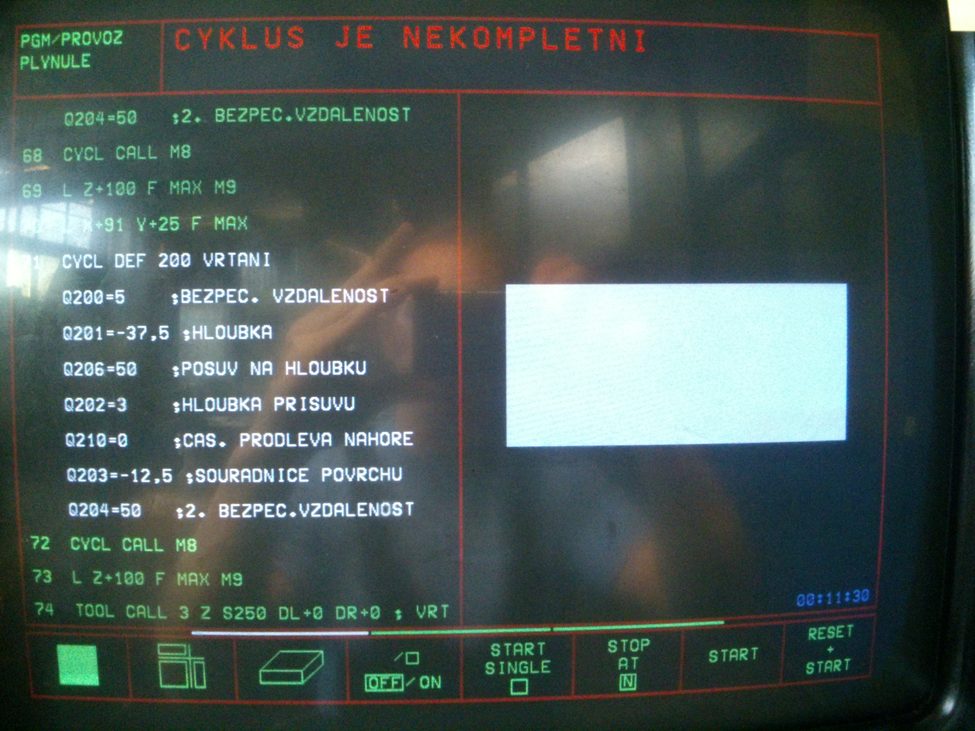 spustil jsem to v režimu TEST, odjelo to 4x LBL, tj. 4 díry a při páté se to kouslo CYKLUS JE NEKOMPLETNI