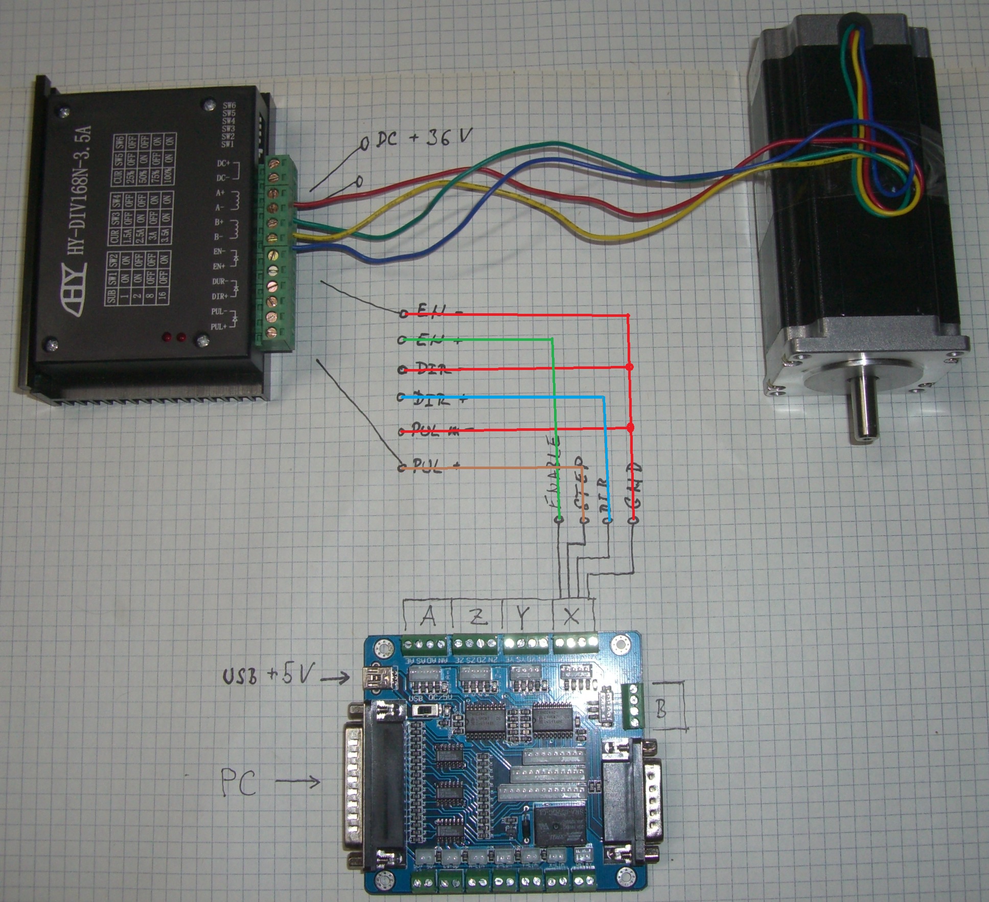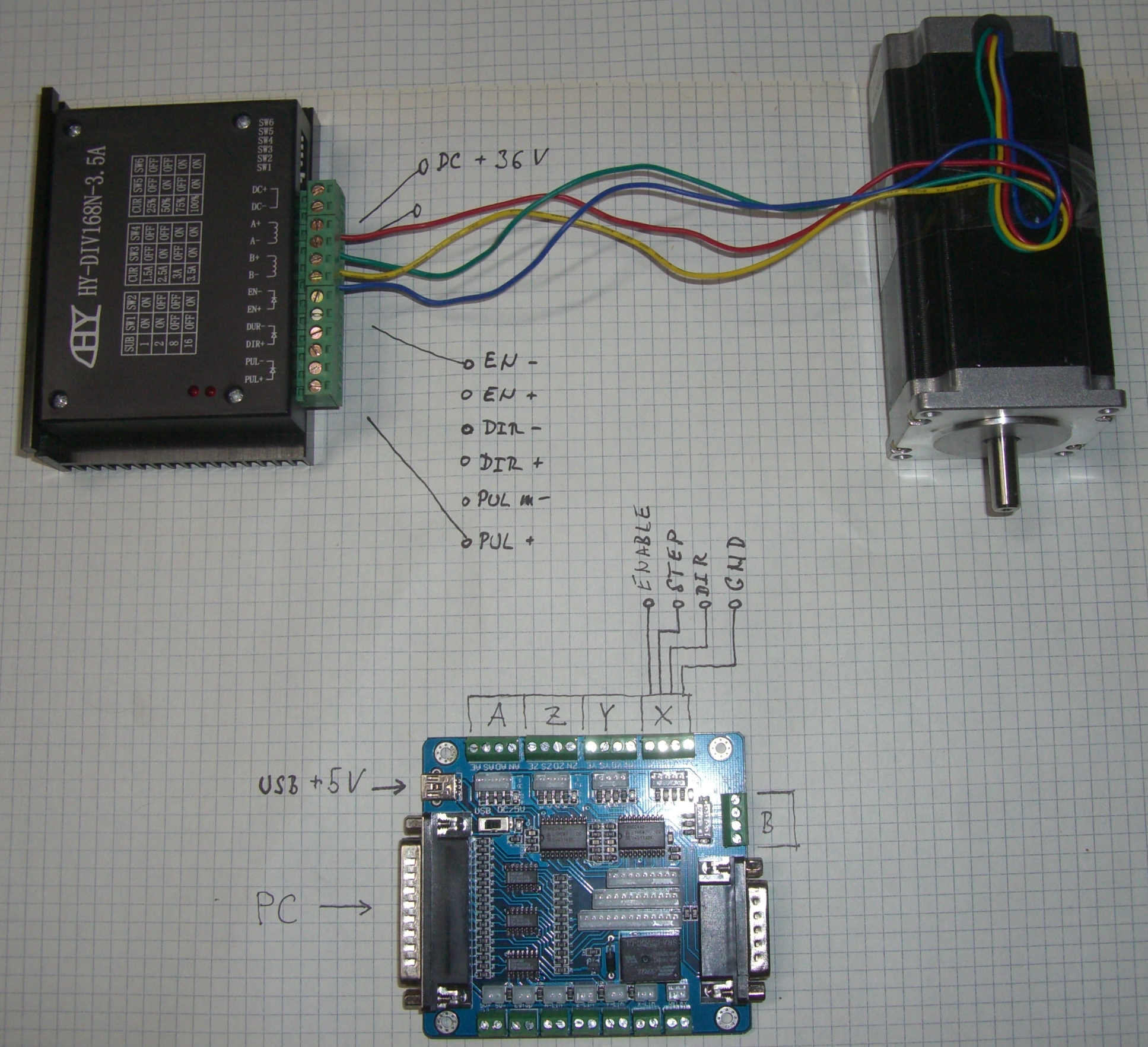 obstaral som si startovaci cinsky kitik - 1x 5-osi kontroler, 1x 36V/3,5A driver, 1x motorcek. zdroj mam zatial vlastny 1x24V. neviem vsak ako mam prepojit dosku s driverom. doska ma 4 vystupy - Enable, Step, Dir, GND a driver ma 6 vstupov - Enable+, Enable -, Dir+, Dir-, Pul+, Pul-. predpokladam, ze Pul = Step. dalej dve svorky na napajanie DC+, DC-. zbezne som driver s doskou spojil len plusovymi pinmi, no moc to nefunguje. v MACHu mam podla navodu ku kontroleru nastavene Motor Outputs na vsetky osi ( v poradi os, Step, Dir : X-2,14, Y-3,16, Z-7,8, A-6,5 , B-4,17 ), Outputs signal mam nastavene Enable 1, 2 , 3, 4, 5 na Pin 17. po prepnuti do manualneho rezimu po stlaceni klavesnice sa meni hodnota polohy na danej osi, blika LEDka na kontroleri ale motorcek sa nepohne. driver jemne piska a drzi motor zabrzdeny v jednej polohe. skusil som postupne zapojit vsetkych 5 osi s rovnakym vysledkom.