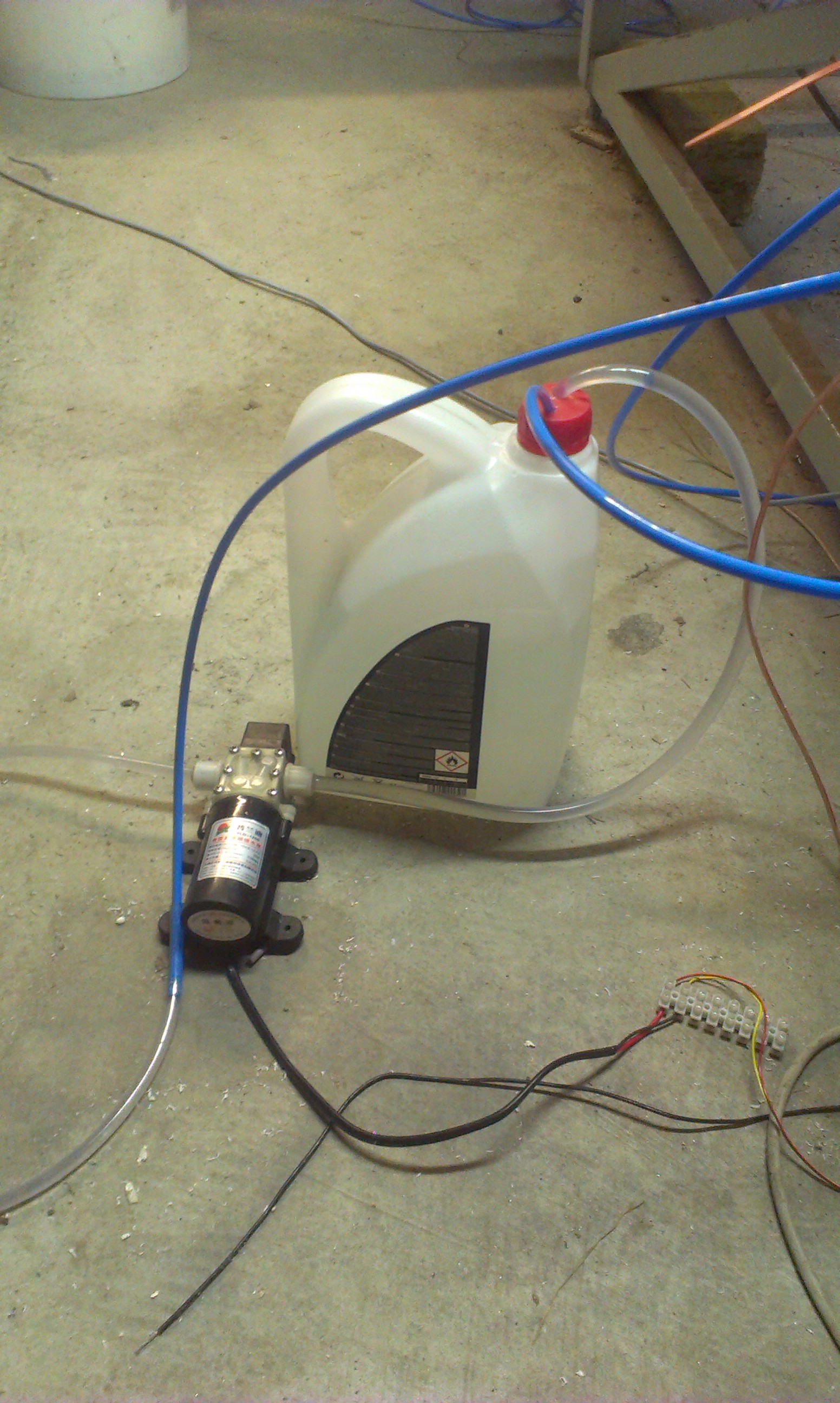 Co jeste neni dodelano, je chalzeni vretena. Zatim mam cerpadlo s dostatecnym tlakem, aby prohnalo potrebne mnozstvi vody dlouhyma tenkyma hadickama, zatim nezapojeny chladic ze srotaku a taky prutokomer z kavovaru, ktery bude hlidat prutok chladiciho media.