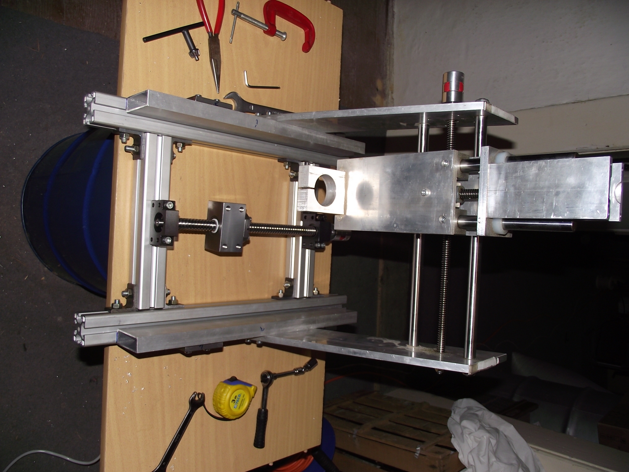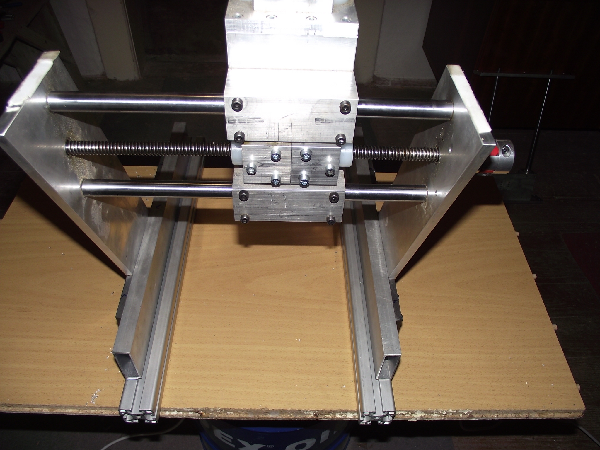 väčšinou fórum len čítam, no teraz som sa rozhodol podeliť o prerábku stroja Kompas H300. Hlavný problém bol prehnutý trapéz na X osi a veľká vôľa v matici čo pri kruhových tvaroch bolo poznať. V zásobe som mal guličkovú skrutku s maticou 16/5 s domkami, Bosh profily a nejaké plocháče. Výmena skrutky mi síce zmenšila obrábaciu plochu z 300mm na 200mm, ale kruh je teraz kruh a nie elipsa. K tomu som ešte na Y osi zdvojil maticu na trapéze. Bosh profily som použil na uchytenie domčekov a za pomoci plocháčov ich prichytil k základu stroja. Ako pracovný stôl je zatiaľ osadená mdf doska - tá sa nahradí hliníkovou doskou 15mm.