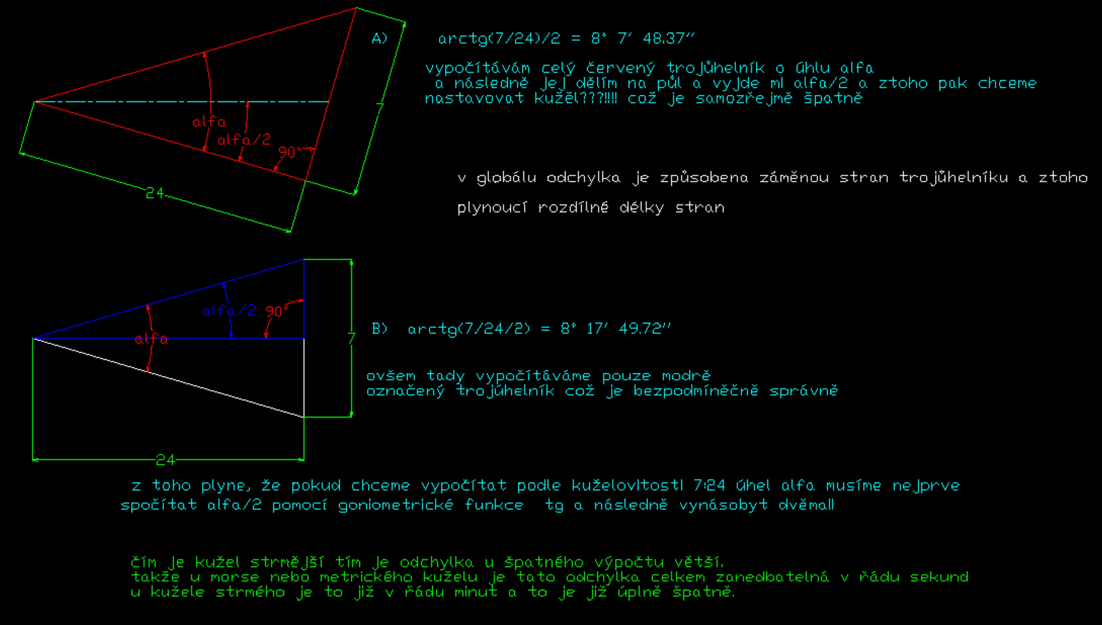 případ A i B je početně správný není nikde chyba ovšem chyba je v naší hlavě, protože výpočet A) není možné použít !!! výpočtem A) si dáváme pravý úhel tam kde není a následně vzniká tvarově a rozměrově jiný trojůhelník ,který pak dělíme dvěma a tento trojůhelník považujeme za trojúhelník správný který je jen ve výpočtu B)