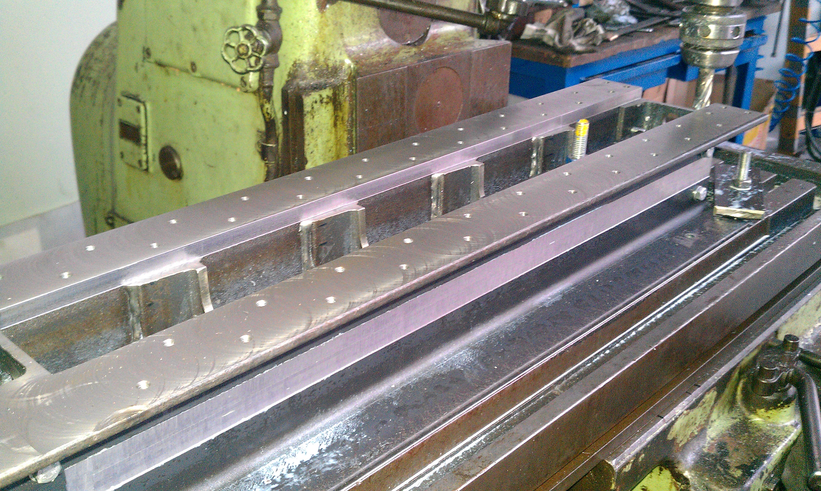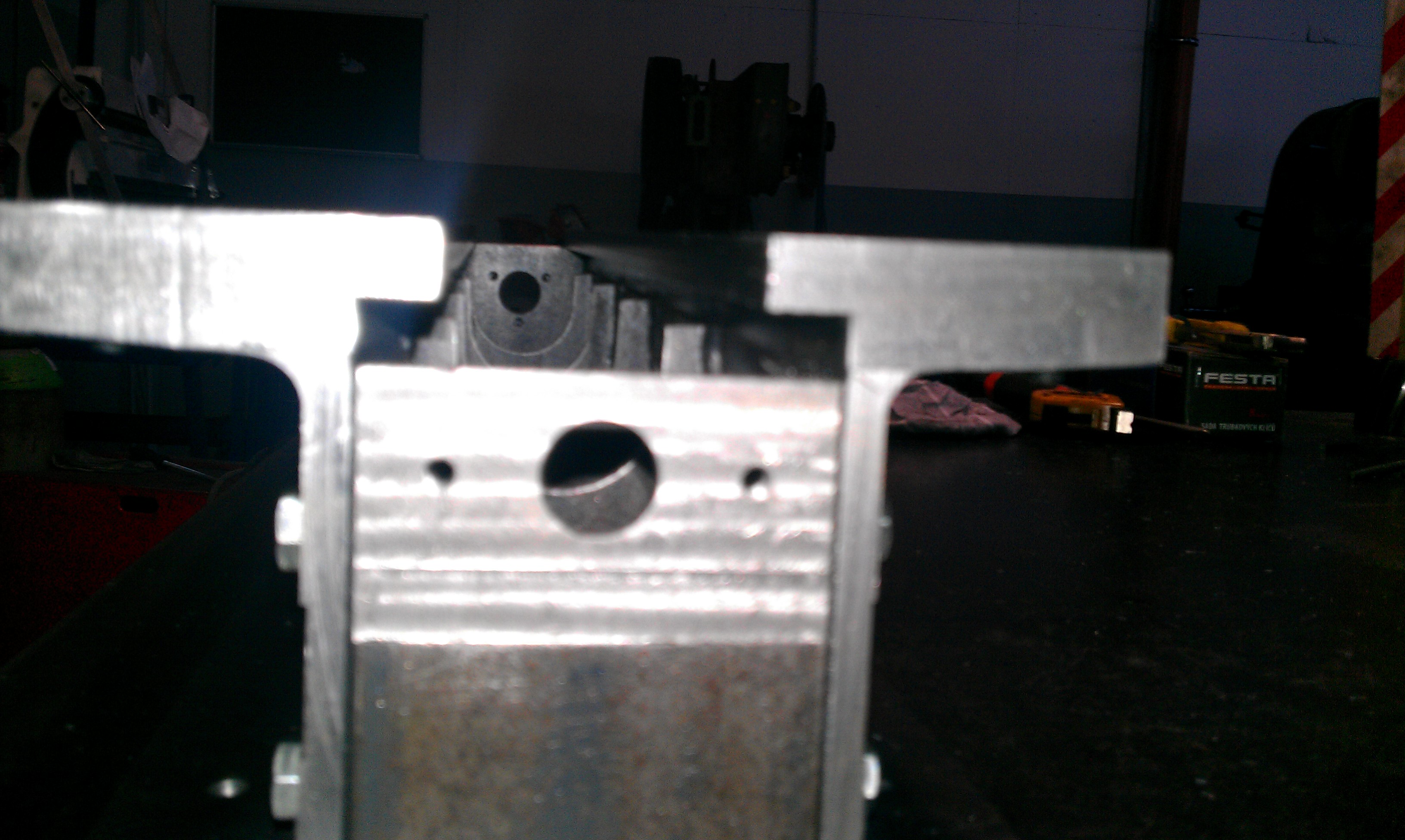 Materiál UPN 120, příčky UPN 80. Svařenec minimální, bez vyžíhání, před vařením jsem to jen prohřál plamenem. Vařeno COčkem a vloženo do skel.vaty, horní plochy šroubovány a ofrézováno vše na jedno upnutí poté co jsem ofrézoval spodek.