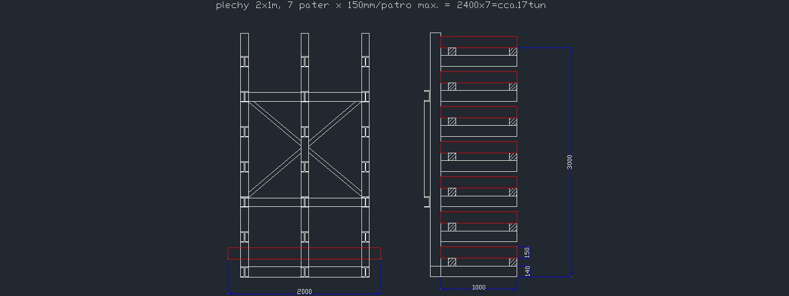 zajdi se podívat do ferony nebo k nějakému prodejci hutního materiálu.. tam maj obdobnej systém a 2-5tun na foch tam maj běžně a zas takové hovadské profily to nemá (myslím ty vodorovné), oni tam mají většinou z hlediska namáhání ideální zužující se profil, v kontaktu se stojkou silnější a pak se zeslabuje.. a nebo se podívej na výrobce regálů a skopíruj to jejich.. ty to budou mít několikanásobně předimenzovaný..