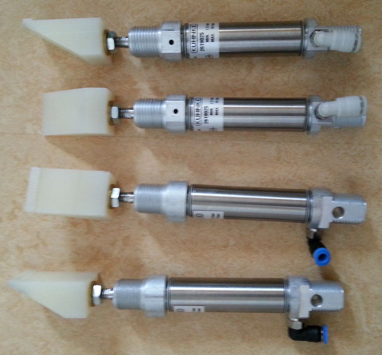 Opět mi tu zbyly nějaké pneumatické válce KUHNKE. Jedná se o delší dvoučinné provedení a kratší jednočinné válečky. Všechny jsou nové, nikdy nepoužité a od obou druhů je k dispozici po 4ks.