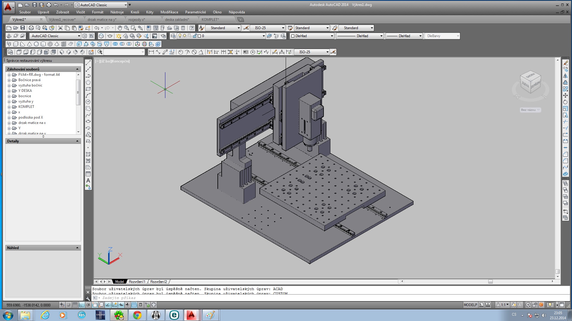 Tak po nějakém čase modelováni sem myslel ze sem připraven na realizaci ale byl sem vyveden z omylu.Tak prosim o vaše rady ,navrhy a připominky. Jedna se o 3 osku.material litina, ocel .zaklad tvori litinova příměrna deska 1000x800. jelikoz ma deska zebrovani zvolil sem sroubovani dilu zvrchu, proto jsou v bočnicich diry. pracovni rozsah 500x400x150. X a Y na hiwinech 25 a Z na 20 ( sehnal sem zde 4x970 25hwin a 2x420 20 hiwin.) pohon krokace 2x2Nm a 1x4 Nm.kuličkove šrouby 20, loziskove domky bk bf15.motory v ose se sroubem spojene spojkou. masina ma slouzit na obrabeni . mekych kovu plastu a dreva,,,,samozrejme ze jako vetsina to musim zkusit i do oceli