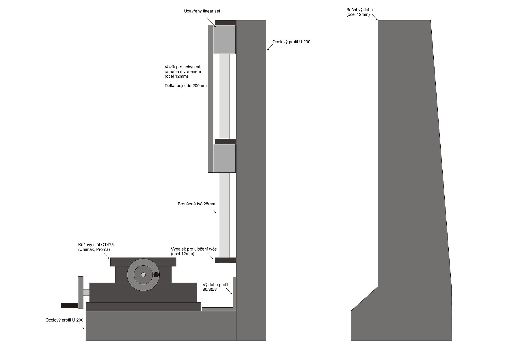 Rád bych si postavil malou né moc nákladnou stolní frézku pro obrábění plastů a hliníku, kterou bych po odladění v manuálním provozu předělal na CNC. Jako základ bych chtěl použít křížový stůl CT475 (s výměnou šroubů a případnou úpravou rybin počítám), který bych uchytil ke konstrukci sešroubované z ocelových U profilů a plechů vypálených na CNC laseru (viz. přiložený nákres).