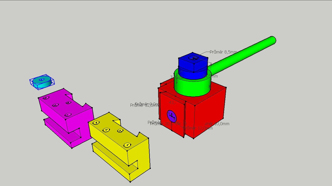 Zdravím našel jsem si návod na rychloupínací nožovou hlavu tady ten odkaz http://dilna.aeroomni.com/images/rychloupinacnozu.pdf" onclick="window.open(this.href);return false; výkresy jsem si překreslil do Sketch-up (lépe pak chápu co kčemu přesně je) Nynější konstrukce 0.1-0.3 je dutá kostka až dolu takže delší pákou excentr zajistí nožový přípravek a kratší pák po dotažení zajistí a přitáhne celý blok k suportu. Mám obovu že při neustálém povolování celého bloku(abych mohl uvolnit delší pákou nožový přípravek) nebude tak dobrá opakovatelnost přesnosti uložení može jako kdyby byla kostak dotažena k suposrtu stále. Moje uprava obrazek 1-5 je dno kostky plné a modrá součáská přitahuje kostku k suportu stále a zelená s tou delší pákou ovládá excentr nezávisle ne modré součástce. Moje obavy a otázky. Bude tadle konstrukce lepší co se týče opakovatelnosti přesnosti uložení nože ? Bude tato konstrukce stejně tuhá jako originál ? ( originál je stahována od zhora až dolu, tato drží ,,jen za spodek kostky,, Po zajištění nožového přípravku excentrem nebude docházet následk vybrací k samovolnému povolování zeleného excentru , když už ho nebude stahovat modrá součástka ? Děkuji