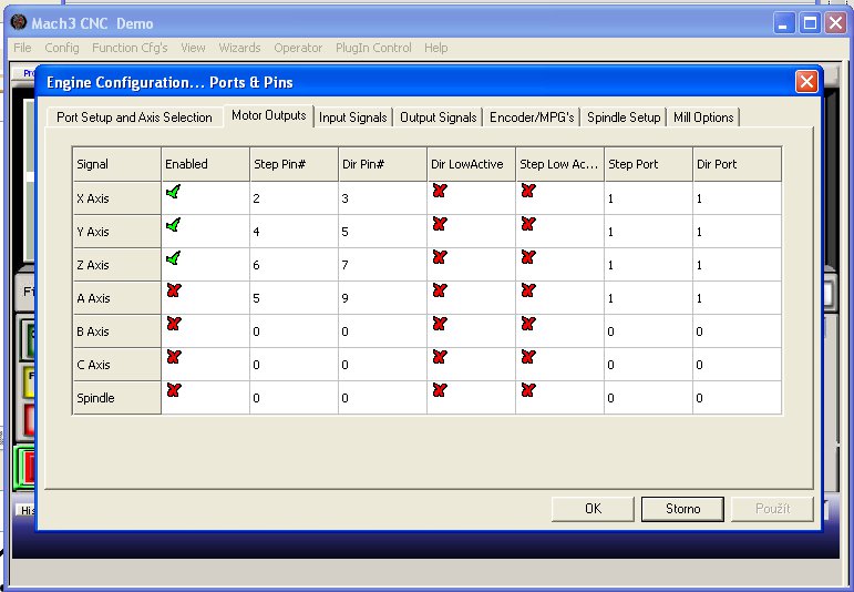 zdravím mám takovou potíž, koupil jsem jeden CNC a nějak to nemůžu spustit. Předtím kyž jsem to kupoval tak jsem to viděl funkční. Na svojí desce nemám vyvedený LPT, tak jsem použil na kšandě. V PC se hlásil jako v pohodě, ale když jsem to zapojil do stroje, tak ten pořád hlásil chybu a nešel restartovat. Tak jsem použil PCI desku Moschip a ten nainstaloval lpt a 2 com. Bylo to označený jako LPT3, našel jsem adresu cd00 viz obr tak to taky hlásilo chybu, když jsem tam dal až tu druhou cc00 tak to teprv přestalo hlásit chybu. Zapojil jsem to podle webu na caucau viz obr, sice to virtuálně funguje, ale motory se nepohnou. vřeteno se zapíná zvlášť. Koncové spínače zatím nemám zapnuty, tak jsem ty x++ a y++ zatím nezapojoval. Akorát ten estop jsem zapojil podle webu na pin17. Když jsem to podle webu zapojil ten digittrig tak to nedělalo nic a když jsem zapojil enable1 tak mi to na stránce diagnostic hlásilo červeně, ale každopádně to ani v jednom případě taky nedělalo nic.