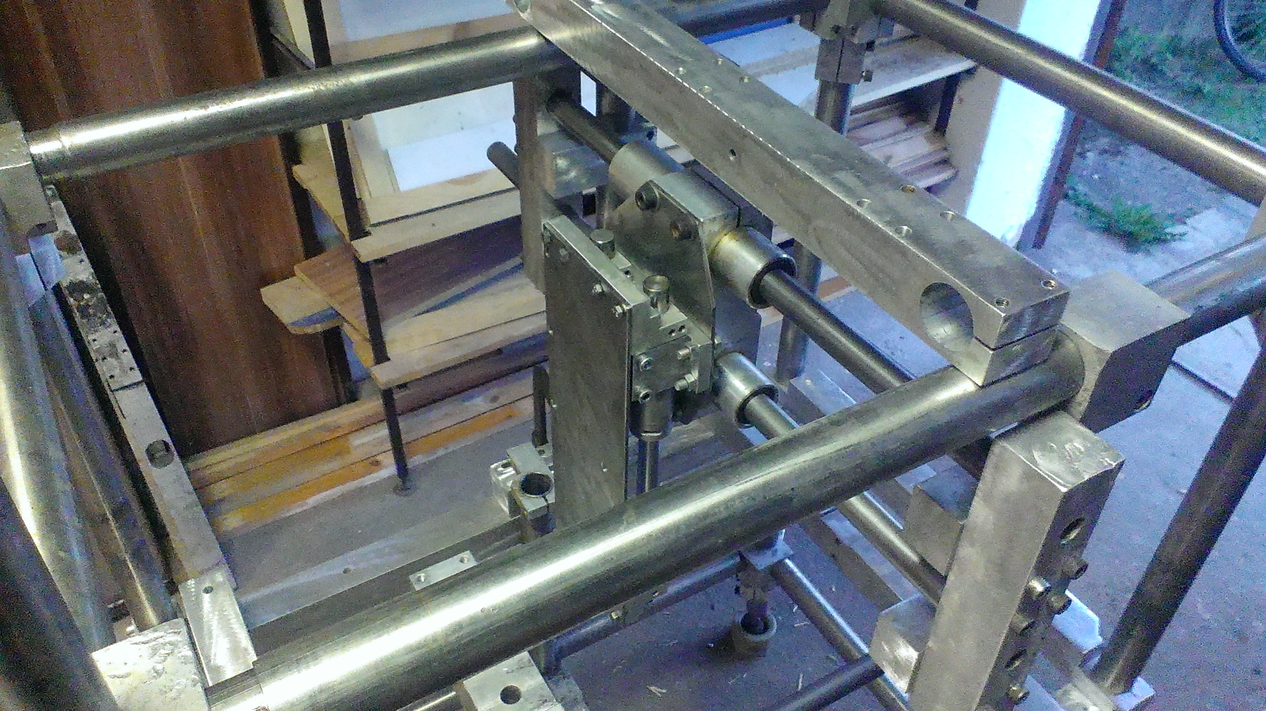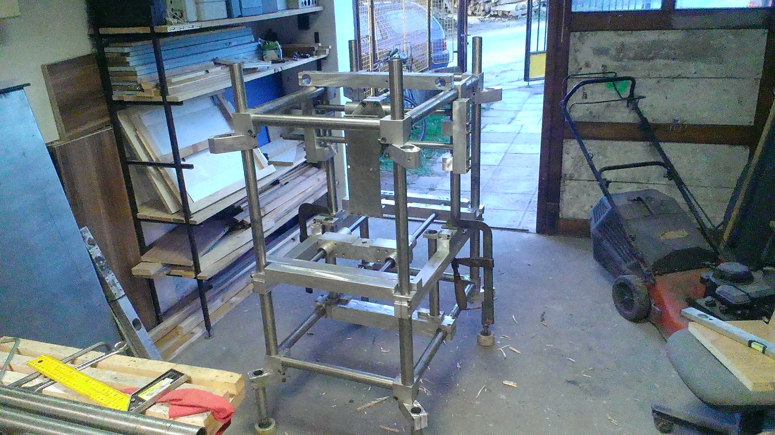 Ty hranoly jsou z duralu, tyce jsou nerezove, jeste pride po jedne do kazdeho rohu az je sezenu, jinak jsme to zkouseli s tatou proti sobe "zkroutit" a ani se to nehlo... Nezda se to, ale snad je to dost pevny... Nahoru prijde jeste deska na ktere bude elektronika a dolu nerezova vana na bordel... Par tyci a hranolu jeste mam, tak je tam nandam abych to provazal...