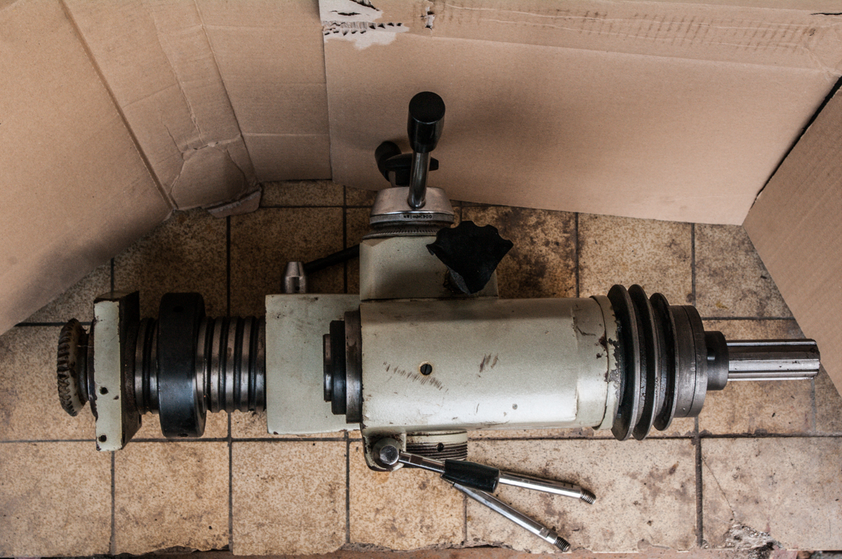 Cena 5000 kč. Dále tu mám frézovací hlavu s čínského komba soustruh/frézka. Docela jsem překvapen zpracováním. Vřeteno má MK3, samozřejmě s průchozí dírou na utažení trnu, má i díru durch na vyrážení kuželů s unašečem. Vysouvat se dá buď pákou, nebo se zapojí šnek a pak se jemně přidává kolečkem (na fotkách je to s tím uraženým plastem). Pinola se dá na frézování utáhnout páčkou. Překvapivě to běhá v kuželíkových ložiskách. Měřil jsem to setinovýma hodinkama a je to v nule. Sloup se vysunuje tím prstencem na velkém závitu, dotáhnout se dá taky pákou. Koupil jsem to před cca 2 lety na nějaké bastlení, ale před časem jsem pořídil nástrojařskou frézku a zbavuju se přebytečností. Ačkoliv se jeví jako potlučená, pravděpodobně nikdy neběhala; funkční části nenesou známky používání. Když jsem to koupil, byla v tom zatvrdlá vazelína. Vřeteno jsem prolíval tak dlouho, že teď chodí, ale ideál by bylo vytahat ty ložiska ven a pořádně je od toho kekelu vyvařit. Dát novou fajnovou vazelínku a tak. Vřeteno ve sloupu je ještě zatuhlé, ale problém bude taky jen stará vazelína.