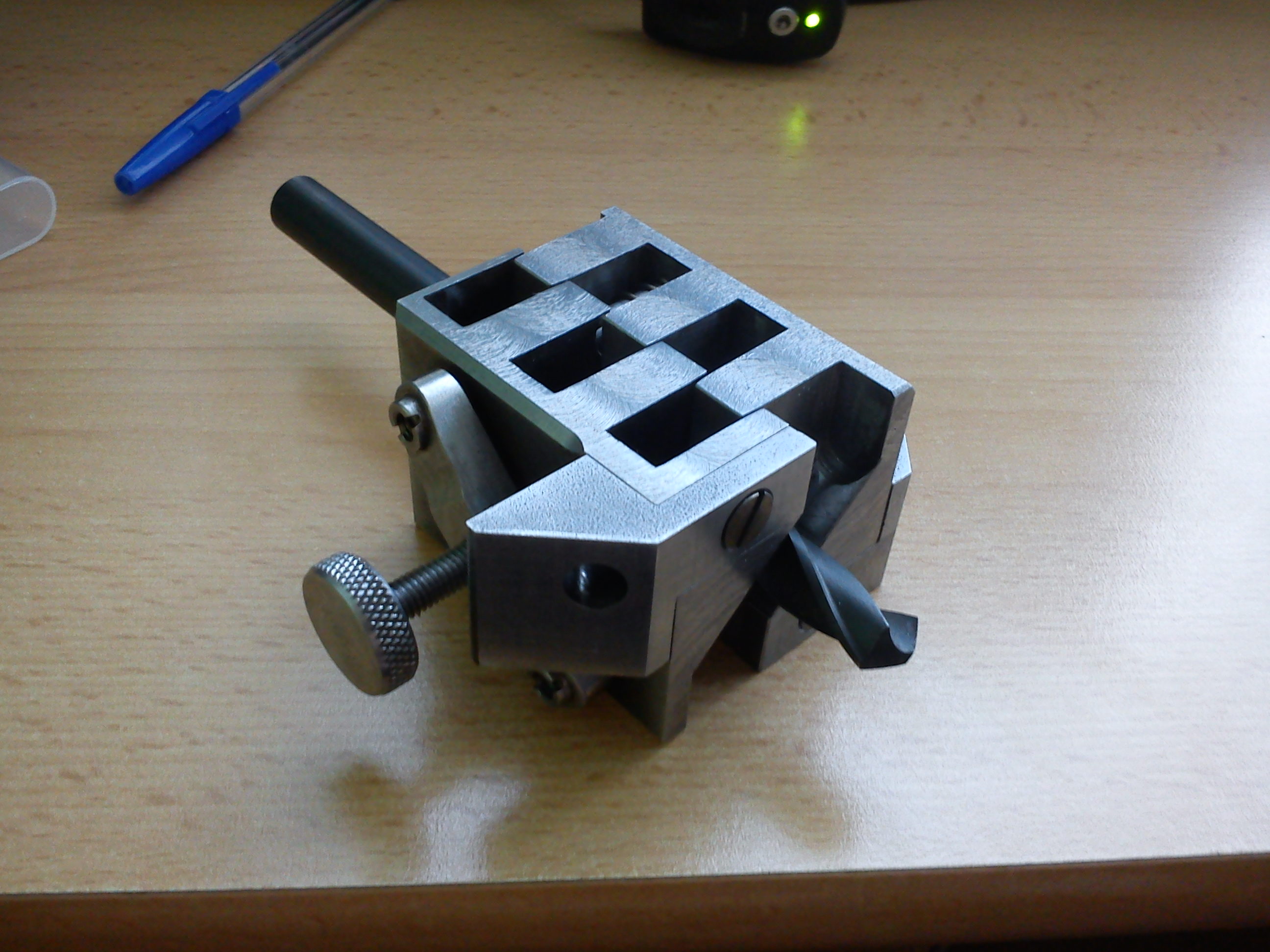 Do tý originální konstrukce bych taky nešel. Mám origo přípravek z ruský nástrojovky a vůbec ho nepoužívám,sice podbrus pěknej ale je to víc štelování než broušení a navíc velikej plošnej styk s kotoučem. Na vrtákách brousim na břitech v dělící hlavě rovný přesně stejný fasetky. Je to rychlý, jednoduchý a děličku mám dost často nasazenou na brusce. Takže bych udělal něco na principu děličky, třeba jenom na ty dvě polohy, ale hlavně takový aby se ti tam ty vrtáky vešly.