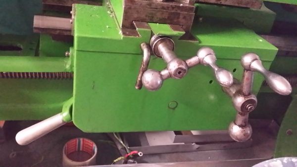 Páka vlevo slouží k odpojení matice od šroubu, zahnutá páčka vlevo vedle kliky příčného posuvu slouží k zapojení (zastrčením) strojního příčného posuvu, klika zcela vpravo je pak podélný posuv. Bohužel žádné další ovládací prvky (na možnou redukci posuvu ze závitových na ubírací) tam nejsou. Proto jsem chtěl soustruh doplnit o nezávislý pohon šroubu s fr. měničem a možností volit si libovolný posuv.