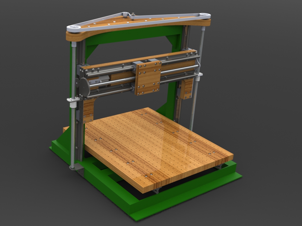 Ide o konštrukciu s pevným portálom, kde na zvýšenie pevnosti v dolných úvratiach Z-osi a tiež na maximalizovanie rozjazdu v Z je uvažovaná pohyblivá celá Y-os tak ako u niektorých 3D tlačiarní. Celú konštrukciu som sa snažil navrhnúť s cieľom maximalizovať rozjazdy všetkých osí vzhľadom k celkovej veľkosti stroja, maximalizovať Z rozjazd a pritom zachovať prijateľnú tuhosť v spodnej úvrati a samozrejme minimalizovať celkovú cenu za stavbu. Niektoré časti stroja sú z MDF, na kritických miestach vystužené okrem Y-kovej osi v horizontálnom smere, tam som počítal že by to mohli dostatočne vystužiť samotné podoprené tyče...