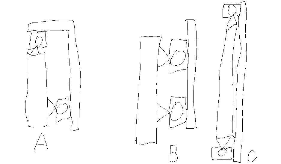 Pokud je dostatečně tubhá konstrukce tak musí stačit centrální jeden šroub , u trona a pod bych dal určitě dva a spojil řemínkem jak jsi psal , a návrh umístění vedení - dle mého by mohl nejlépe co se týče vůlí a namáhání vyjít návrh A , céčko určitě nedělej budes e ti to nejhůř usazovat a pdo.