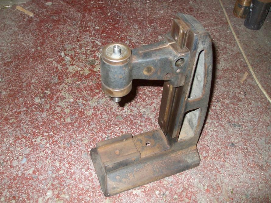) toto asi 30 cm torzo nejakej vŕtačky? Vreteno už asi nejaký kutil upravil- sa mi zdá velký nepomer medzi vretenom s kuželom B16, a hrebeňom s pastorkom s jemnými ozubením. Inak je to dielensky precízne spracované, a mohlo to byť vyrobené niekedy koncom prvej polovice minulého storočia. Má to na súčiastkách vyrazené výrobné číslo 121, tak ich bolo vyrobených viacej, no nikde neni žiaden názov, ani znak výrobcu. Mohla to byť aj nejaká mini brúska na stopkové telieska