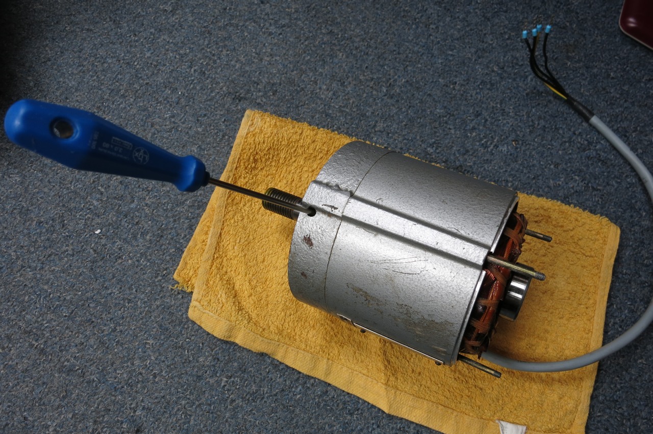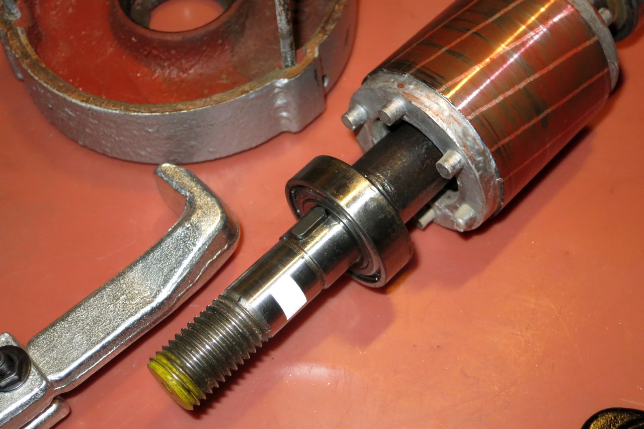 takten přední štít s rotorem musí jíturčitě oddělitod těla statoru , mělo by to jít odrazit z boku silonovou paličkou prostě do toho párkrát bouchni , a pak nejlíp pod lisvylísovat hřídel s ložiskem z toho štítu . jetsli je tam lepidlo tak prohřát na 80°C a mělo by topovolit .