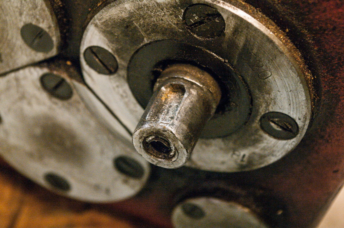 Další je malá převodovka. Rozměry skříně cca 27x21x18 cm. Rychlosti (viz štítek) pro motor 1500 ot/min. Bohužel jedna hřídel má vyžvejklou drážku pro perko (foto), ale s tím se dá poradit. Kola nejeví známky opotřebení, vše funguje jak má, nicméně v provozu jsem ji neměl, těsnost hřídelí taky nezjištěna.
