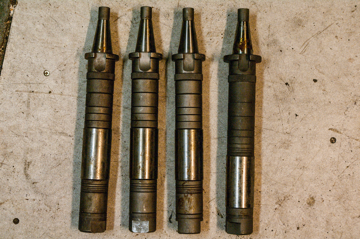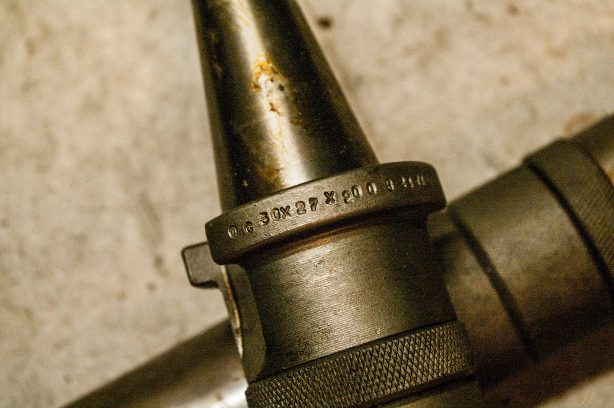 Dále tu mám čtyři horizontální trny ISO30x27x200. Jsou na nich zbytky konzervační vazelíny, vypadají nepoužitě, až na jeden, který má viditelný otisk po upnutí do dutiny (nejde o poškození, jen o otisk, viz. foto).