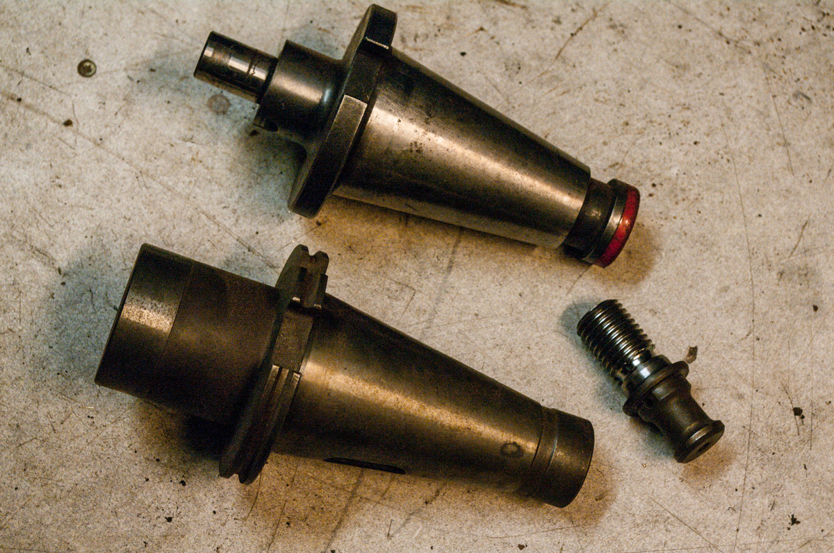 Dále dva trny ISO50, jeden je redukce na MK4, druhý má průměr 22 a délku 30 mm, bez matice a podložek. Stav bez poškození, plus jeden vtahovací čep.