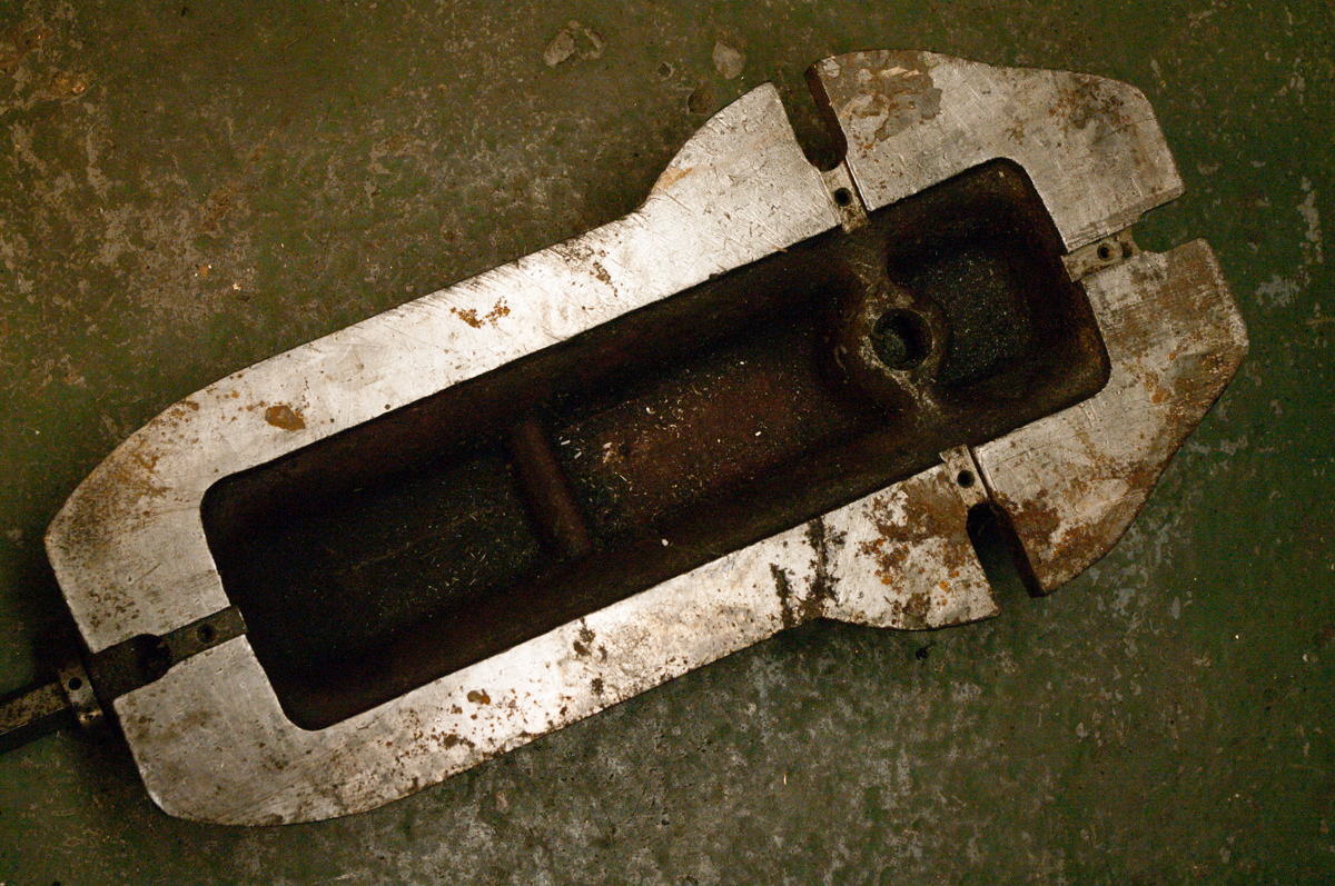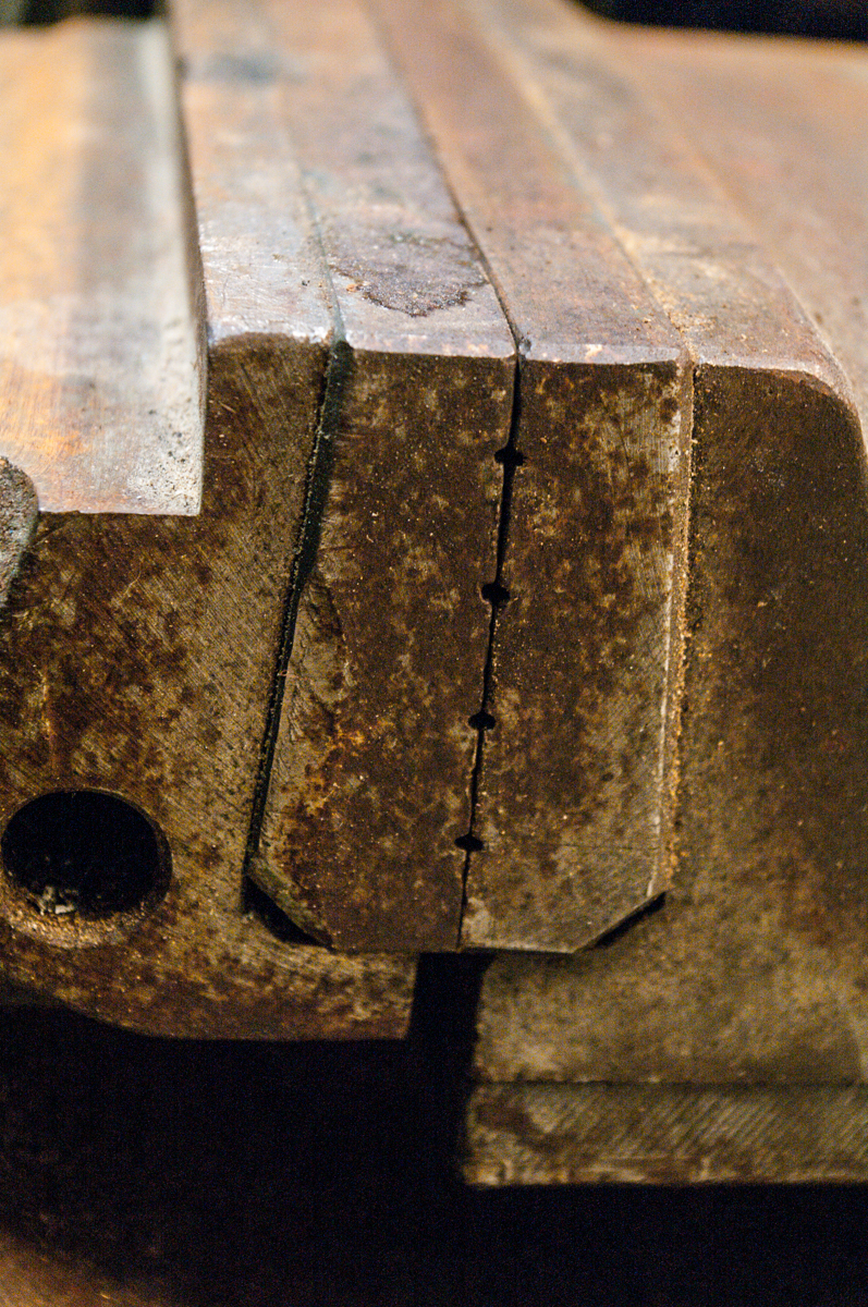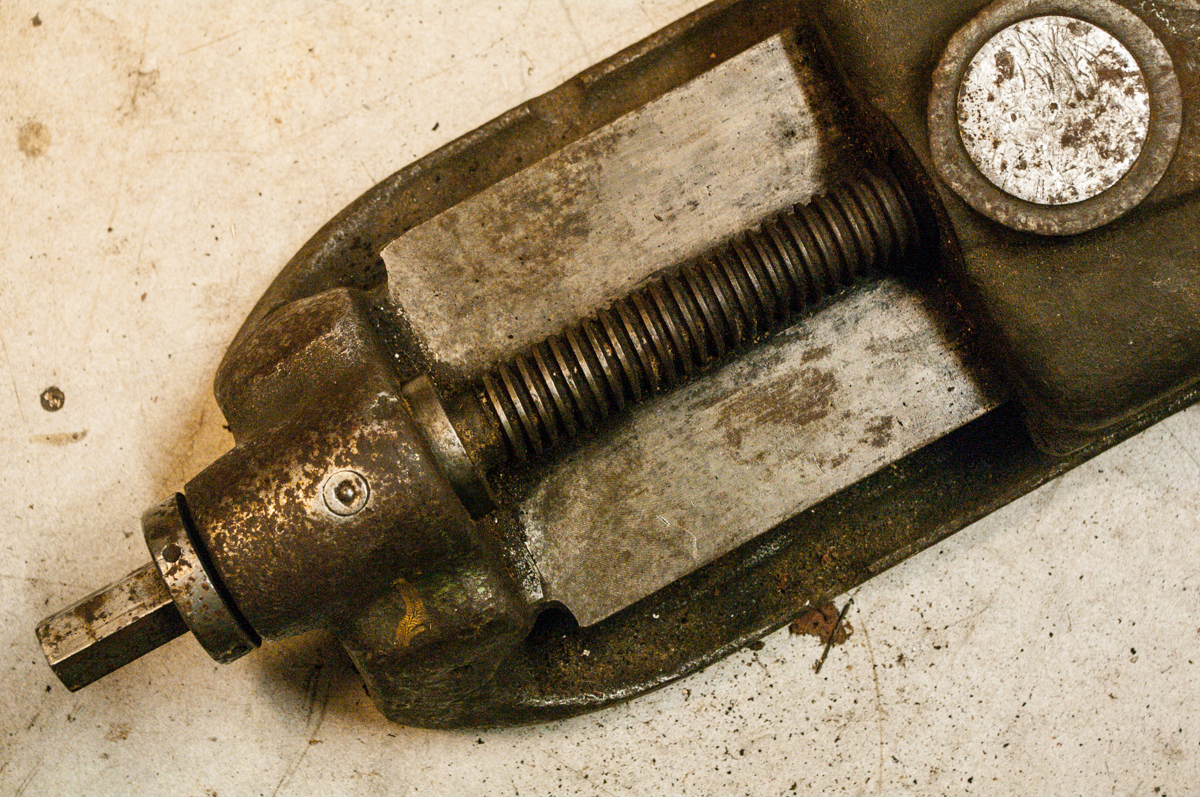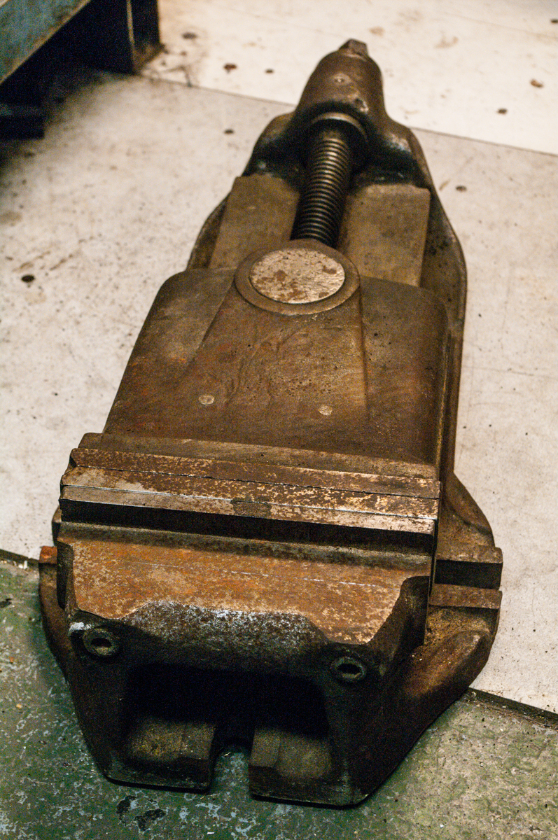 A nakonec svěrák, který se ke mně dostal víceméně omylem. Šířka čelistí 200 mm, stav orezlý, čelisti s malým zafrézováním na jednom konci. Šroub má samozřejmě vůli, nezkoušel jsem regulovat. Na kluzné ploše jeden závrt hned u čelisti, jinak běžně potlučená od obrobků. Pohyblivý člen se jeví bez vůle. U pevné čelisti je zafrézování, zřejmě kvůli používání kotoučových pilek. Nemám čas to čistit, nicméně myslím, že pod tím humusem bude kus slušně použitelné litiny.
