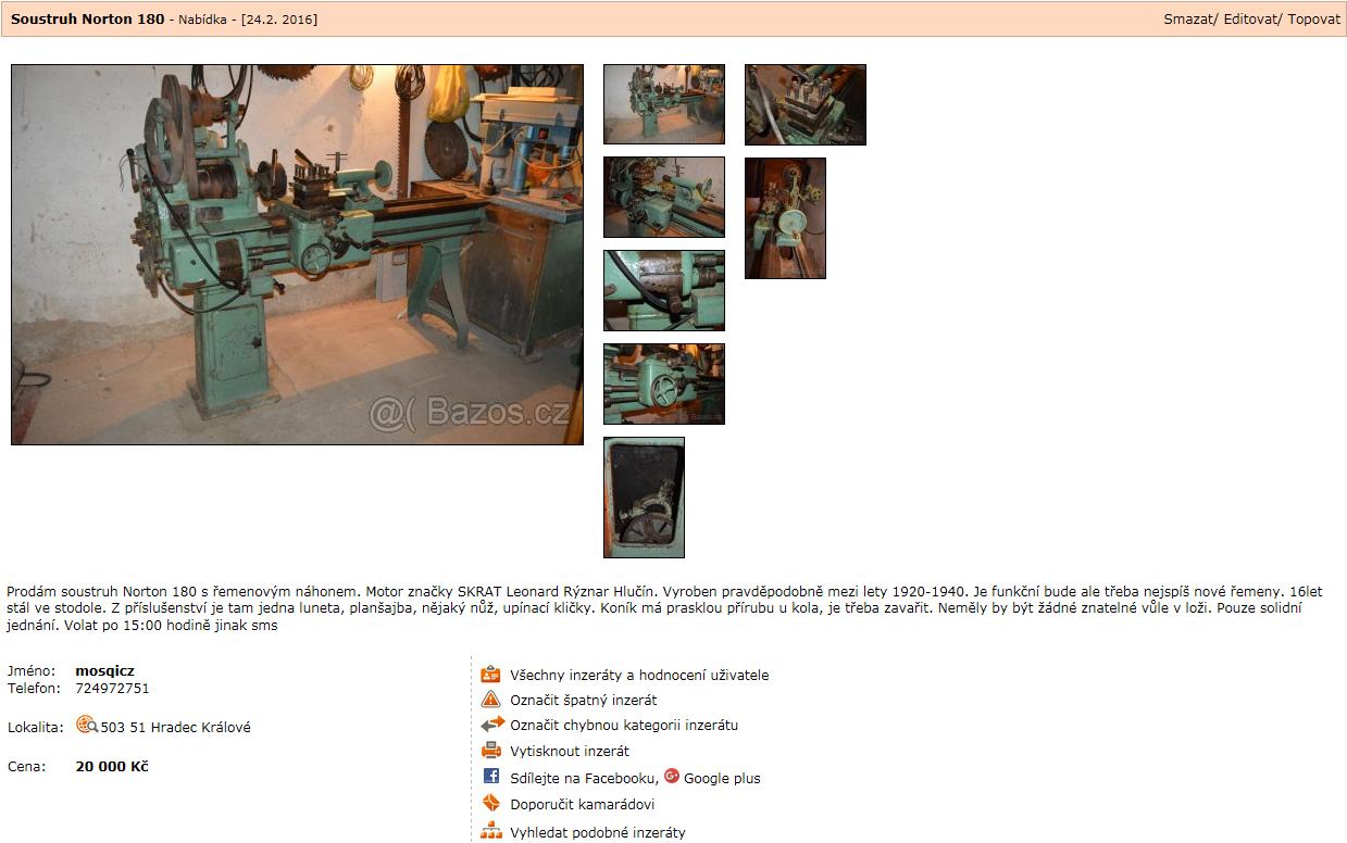 po dědovi jsme vyhrabali ve stodole tento soustruh a docela by mě zajímalo, co je to za výrobce, jelikož jsem zatím nikde nenalezl štítek, krom nápisu na převodové skříni Norton 18. Děkuji za jakýkoliv postřeh.