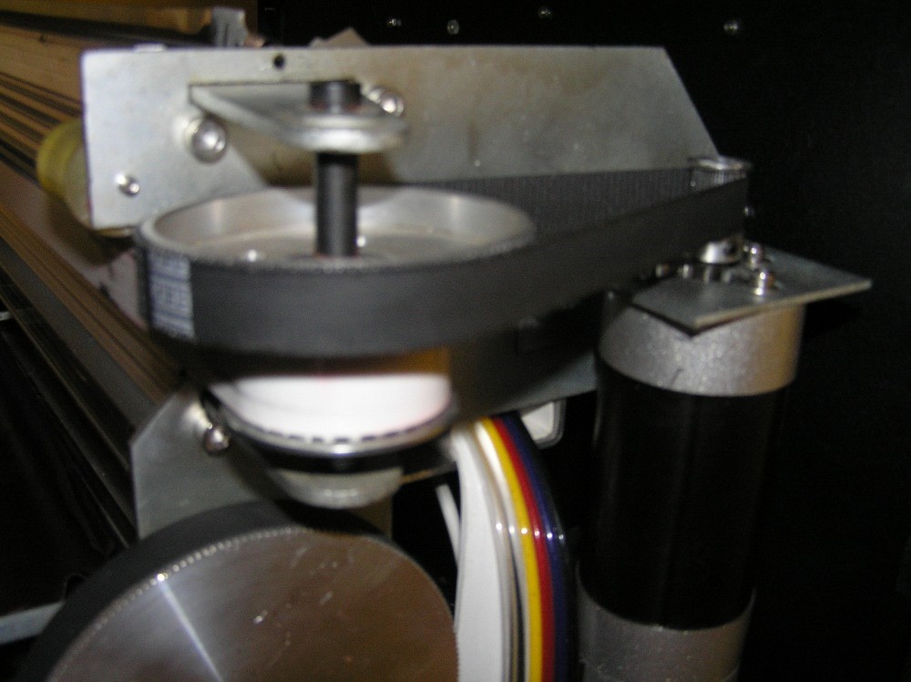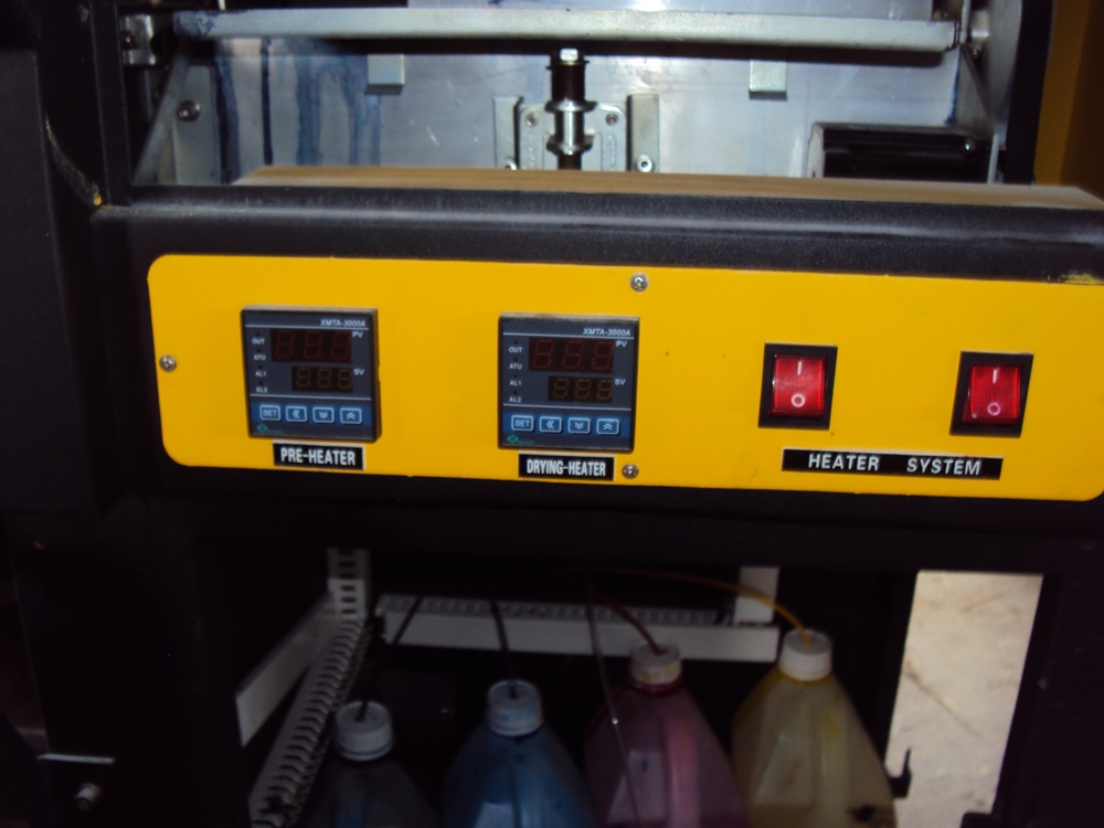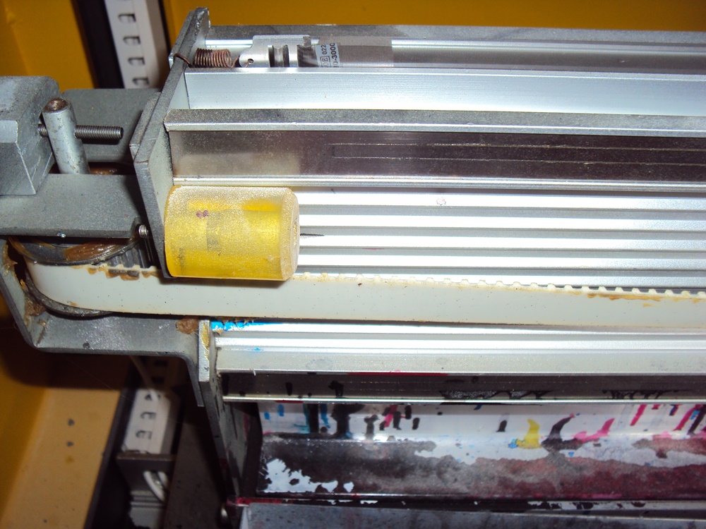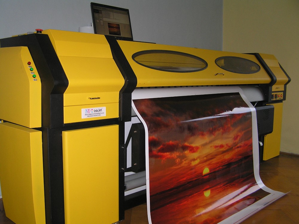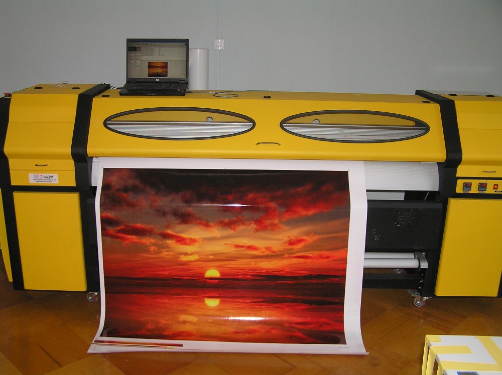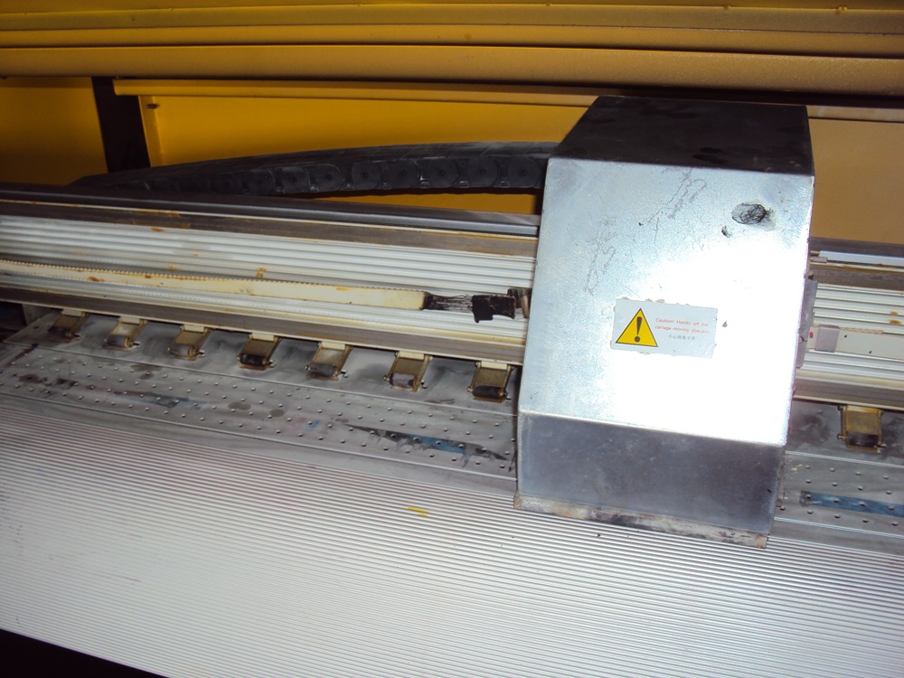 Tiskárna krátkou dobu tiskla, ale nepodařilo se nám na ní odstranit tisk světlejších průhu u velkých stejnobarevných ploch viz. foto banneru následně odešly tiskové hlavy a už jsme do tiskárny nechtěli investovat. Serva a ostatní komponenty jsou plně funkční. Tiskárna je na kolečkách je celkově dlouhá 3m a váží cca 400 kg dá se rozšroubovat na tři díly na bočních dílech je spustu dvířek ať je vše dostupné z každé strany. Po celé délce je tisk vyhřívaný a je tam cca 15 větráku pro vysoušení tisku. Tiskárna byla ovládaná pomoci USB kabelu. Jsou tam použity dva motory pro tisk a dva pro odvíjení a namotávání materiálu. Zdroje viz foto. Dále pak je tam spoustu čerpadel pro podávání inkoustu. Tiskárna je stará přes dva roky a investice do ní byla nějakých 8,5 tis. USD. Naše úvahy byly tiskárnu předělat na řezačku tapet a papíru, ale z časových důvodu k tomu nedošlo.
