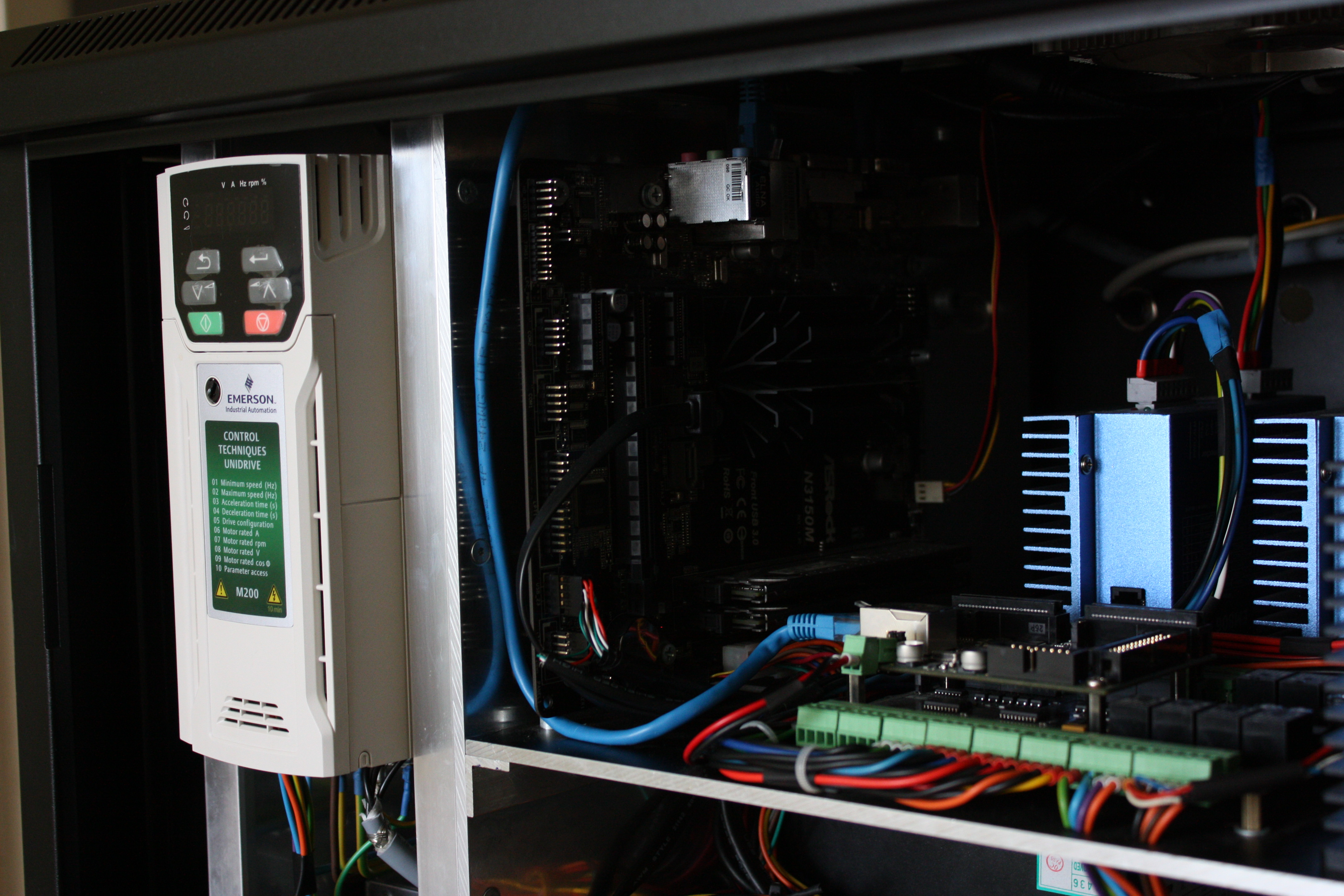 Součástí elektroniky je i frekvenční měnič Unidrive M200-03-2-00100-A-2,2kW a vysoko otáčkové vřeteno tak též 2.2 kW a 24000 otaček. Ale čína. Není to klasika. Ale je taky z činy. Posléze uvidíme jak to pojede.