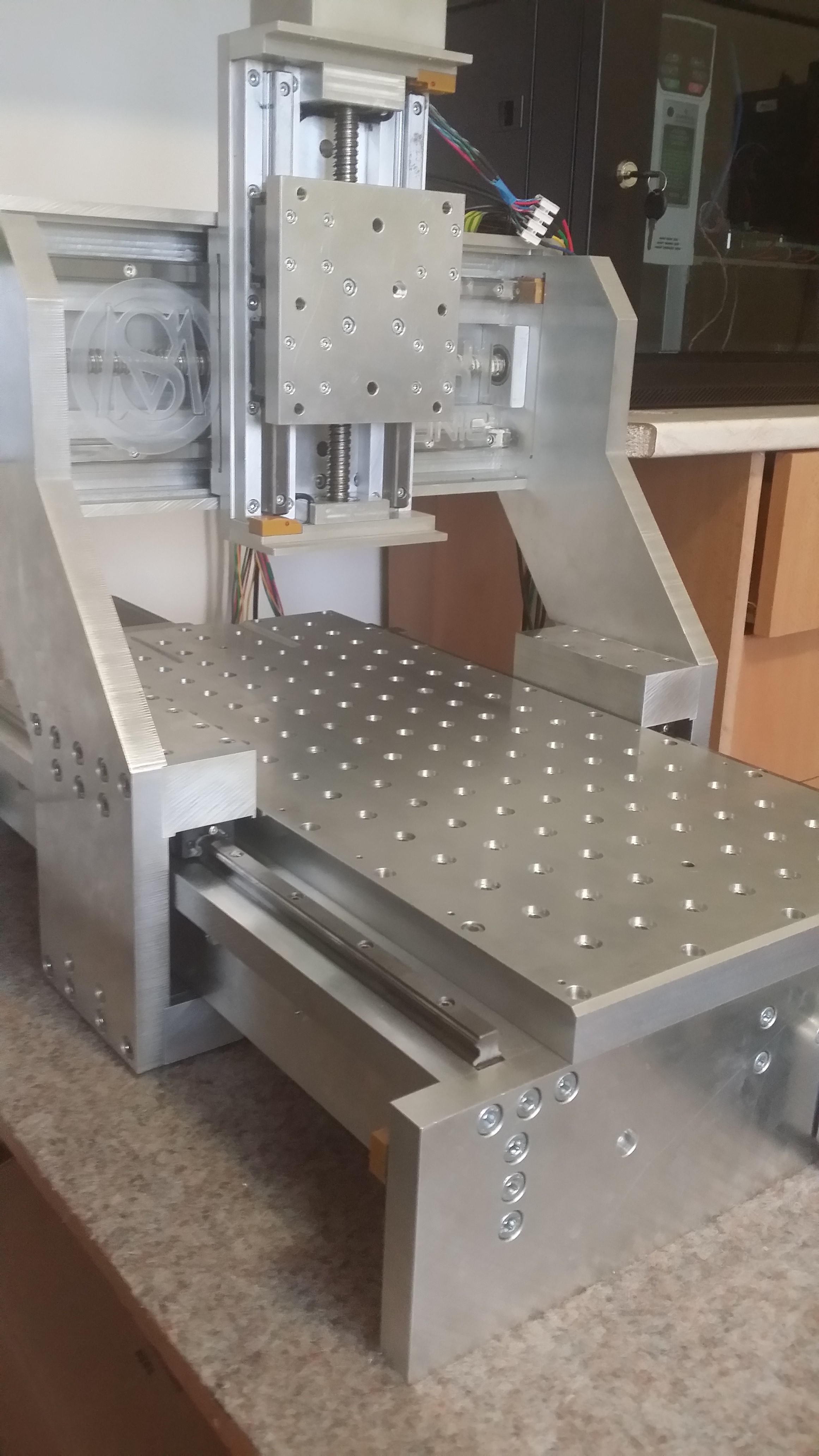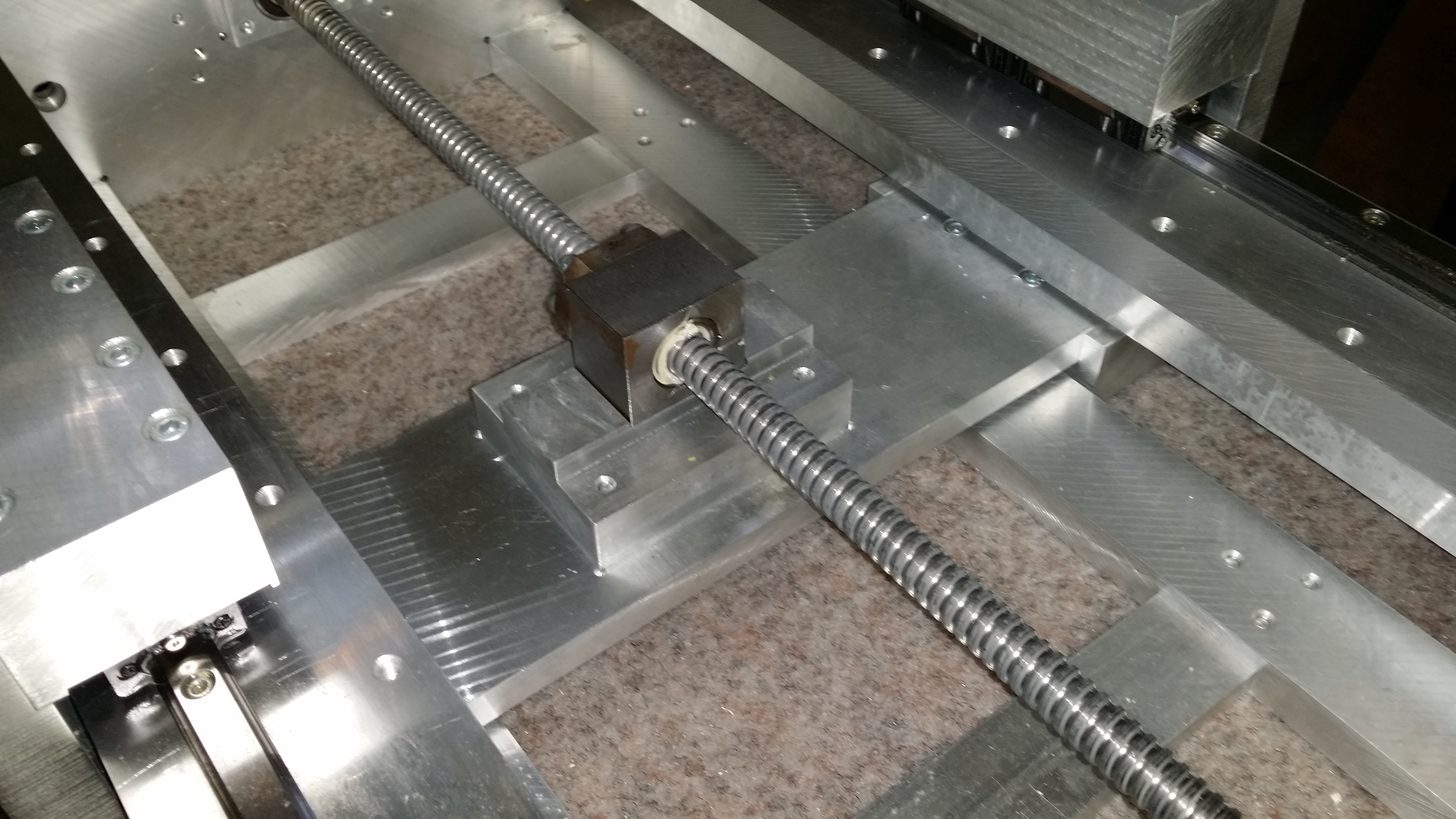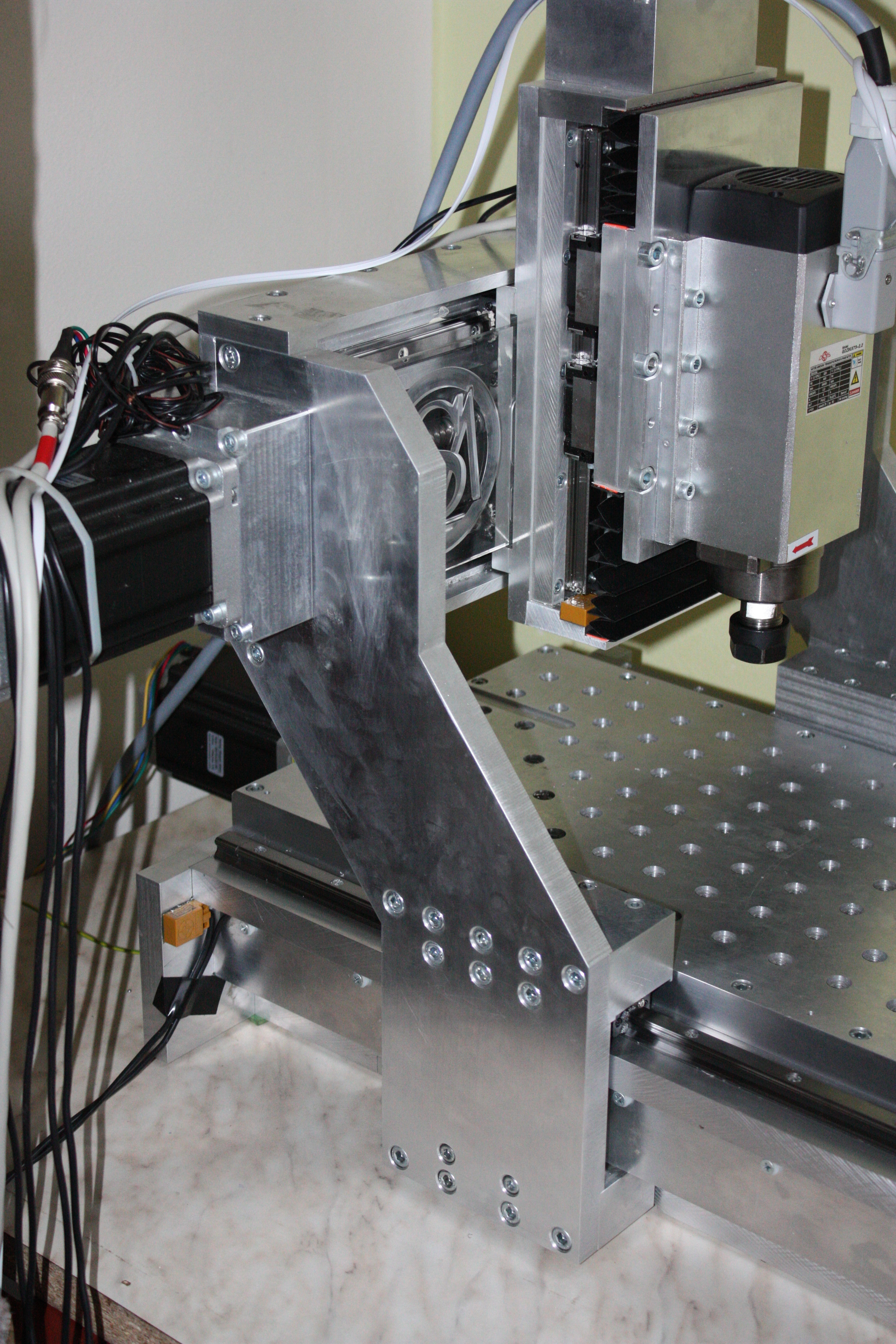 Podstatou bylo mít vše mnohem lìp udělané a ze silnějších materiálu a přesnější. Místo podepřených tyčí použít lineární vedení a trapézove šrouby nahradit kuličkovými. Vše se povedlo. Akorad se ukázalo, že uložení lineárních kolejnicv na ose X na ležato vedle stolu nebyl tak uplně dobrý nápad. No chybama se člověk učí a tak to projde ještě úpravou. Problém je v tom, že při frézovaní v ose X to není dostatečně tuhé a ma to lehkou tendeci přetlačovat a rozvybrovat. Jak jsem již psal tam dojde k úpravě. Ani nevime proč jsme ty lineáry takhle uložili. Byla to blbost.