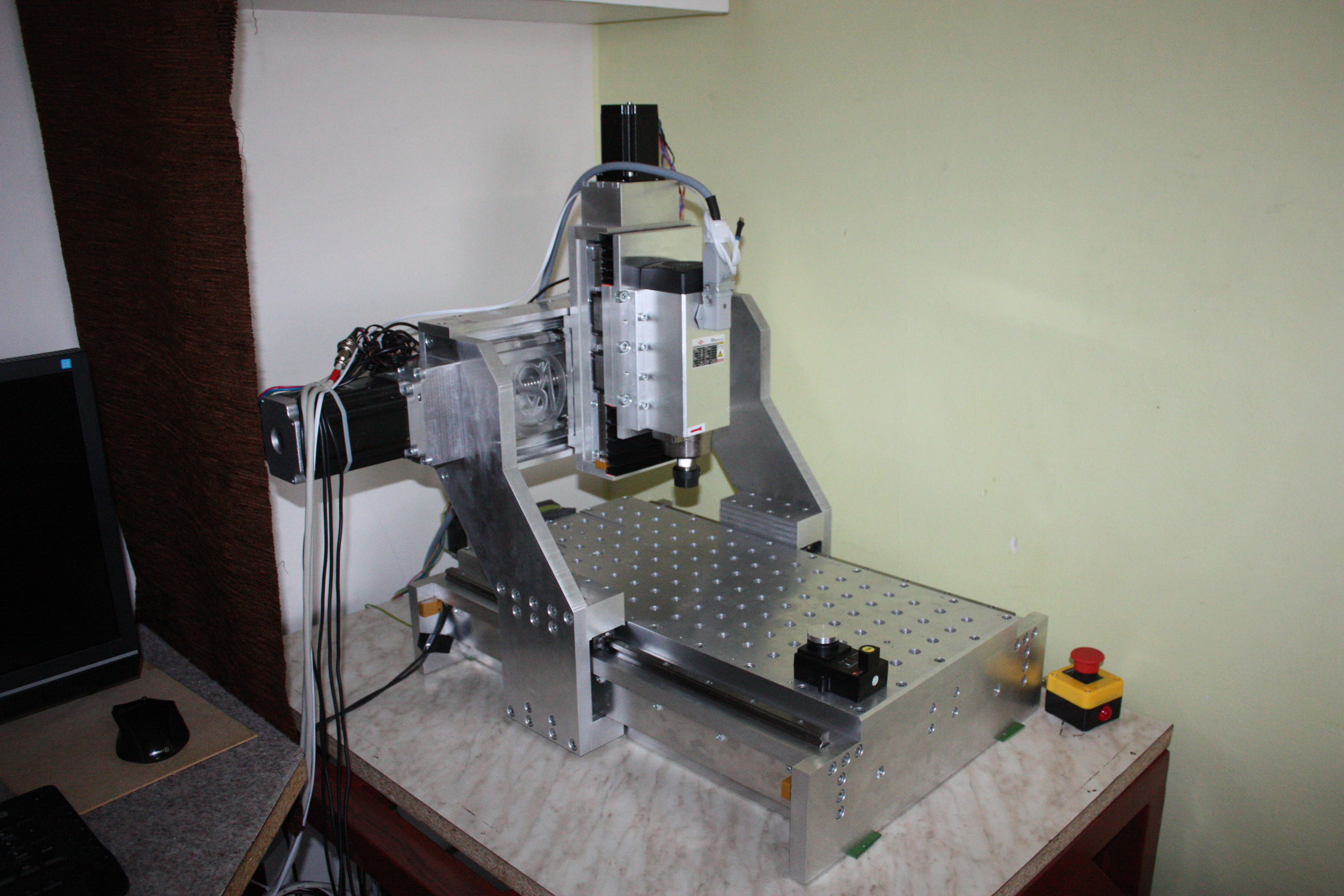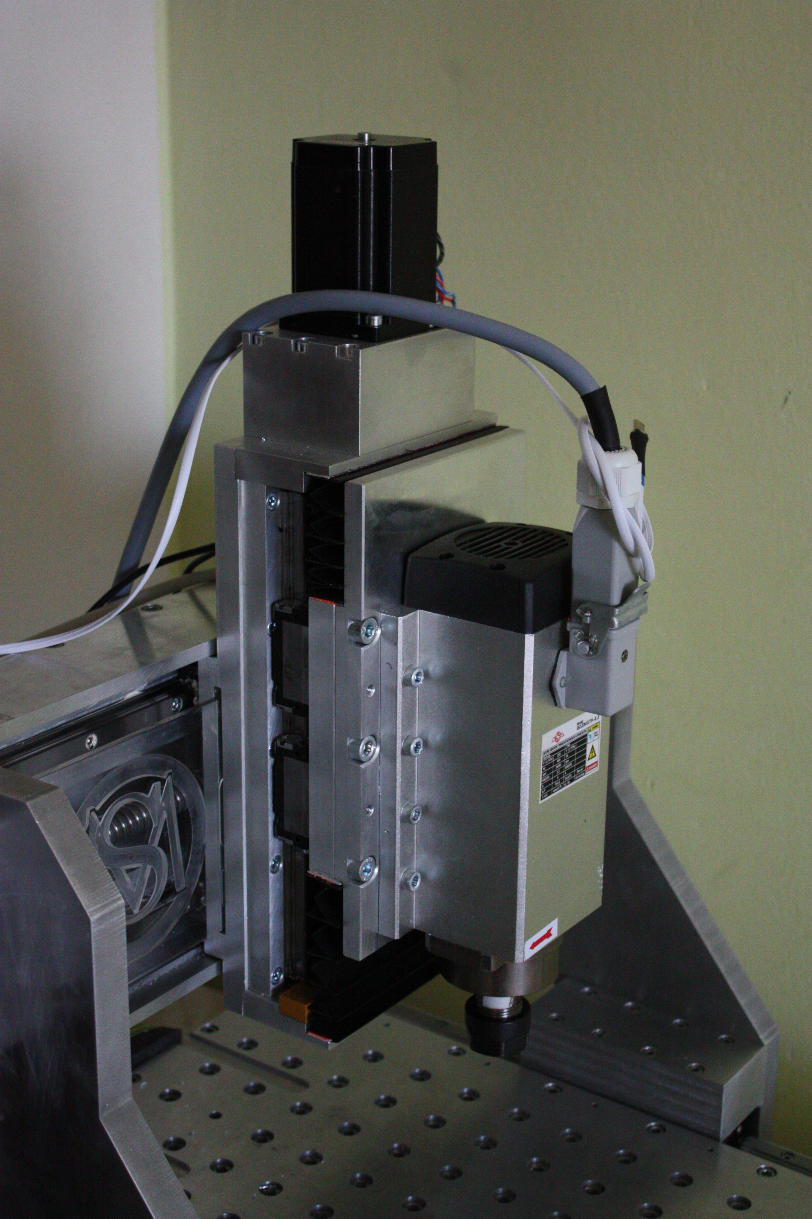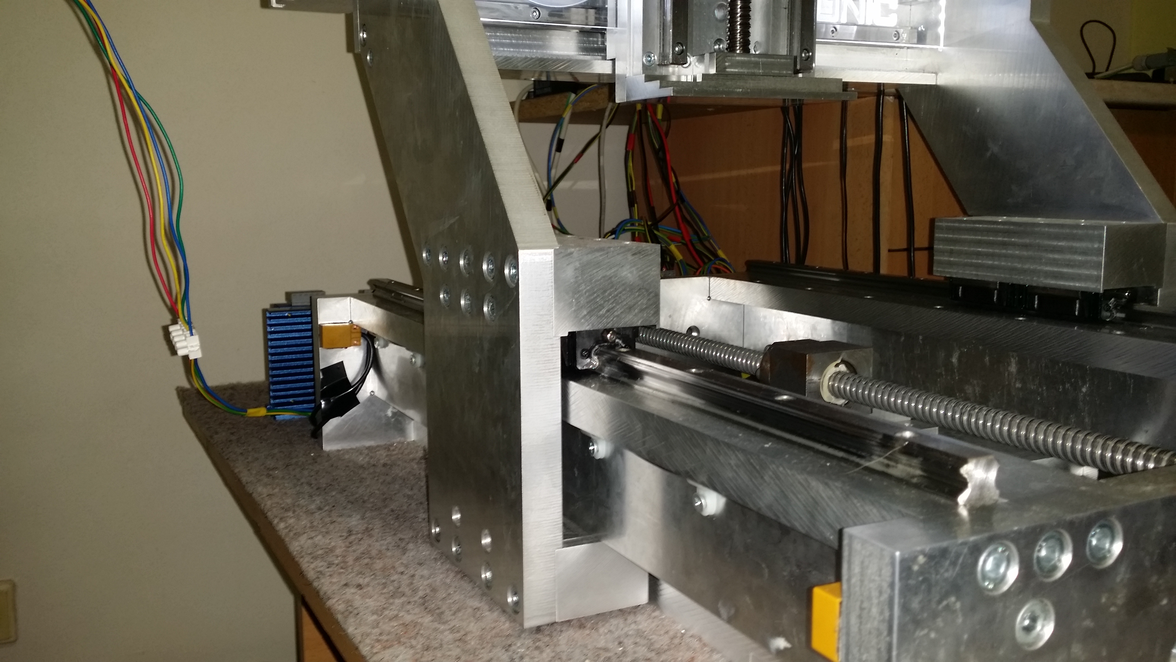 Podstatou bylo mít vše mnohem lìp udělané a ze silnějších materiálu a přesnější. Místo podepřených tyčí použít lineární vedení a trapézove šrouby nahradit kuličkovými. Vše se povedlo. Akorad se ukázalo, že uložení lineárních kolejnicv na ose X na ležato vedle stolu nebyl tak uplně dobrý nápad. No chybama se člověk učí a tak to projde ještě úpravou. Problém je v tom, že při frézovaní v ose X to není dostatečně tuhé a ma to lehkou tendeci přetlačovat a rozvybrovat. Jak jsem již psal tam dojde k úpravě. Ani nevime proč jsme ty lineáry takhle uložili. Byla to blbost.