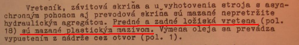 Predne lozisko: Ano, vo vretene je navrtany kanalik a na jeho honci zapichnuta plitka drazka. Na vutornom prstenci loziska je takisto vybrusena plitka drazka a vyiskrene 3 dierky. Pokial uz lozisko menili za nove, tak vacsinou sa davaju bez dierok kedze to s mazacou drazkou ( to oznacenie W33 za cislom loziska ) sa tazko zhana a stoji majland. Robim to tak, ze zozeniem na bazosi poctive loziska made in CSSR a dam do do nich do prostriedku vyiskrit 3 dierky o priemere 3mm po 120 stupnov. V uzivatelskom manualy o tom nic nepisu pretoze to nema robit obsluha stroja, ale vyskoleny servisny technik, kedze treba vediet spravne odhadnut mnozstvo tuku ktore do toho predneho loziska natlacis ( pretoze vela tuku vo vnutri predneho loziska sposobi nekludny chod vretena pri vacsich otackach, takze bacha nato )a takysto obtiazne strcit prsty alebo nejaly ohnuty kusok gulatinky poza deklik a vytriet prebytocny tuk.